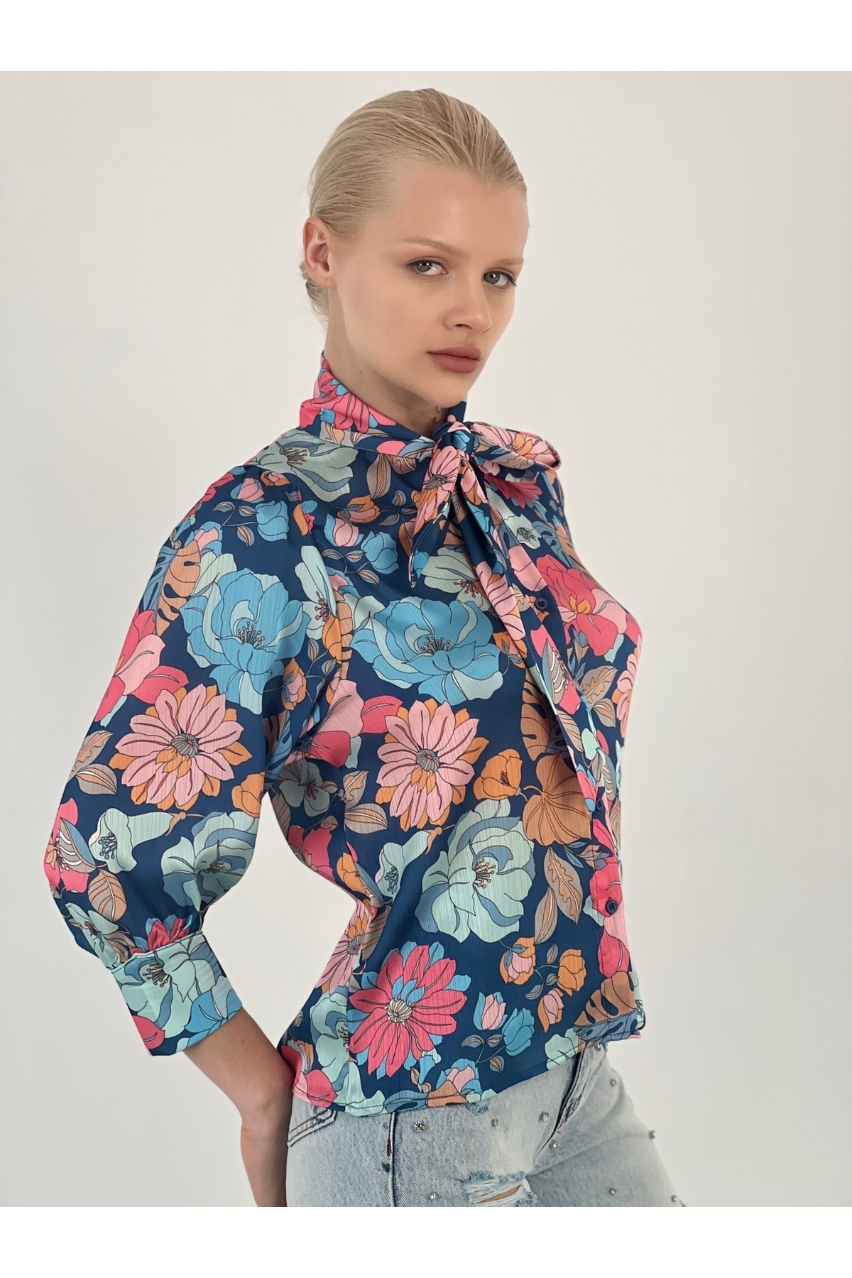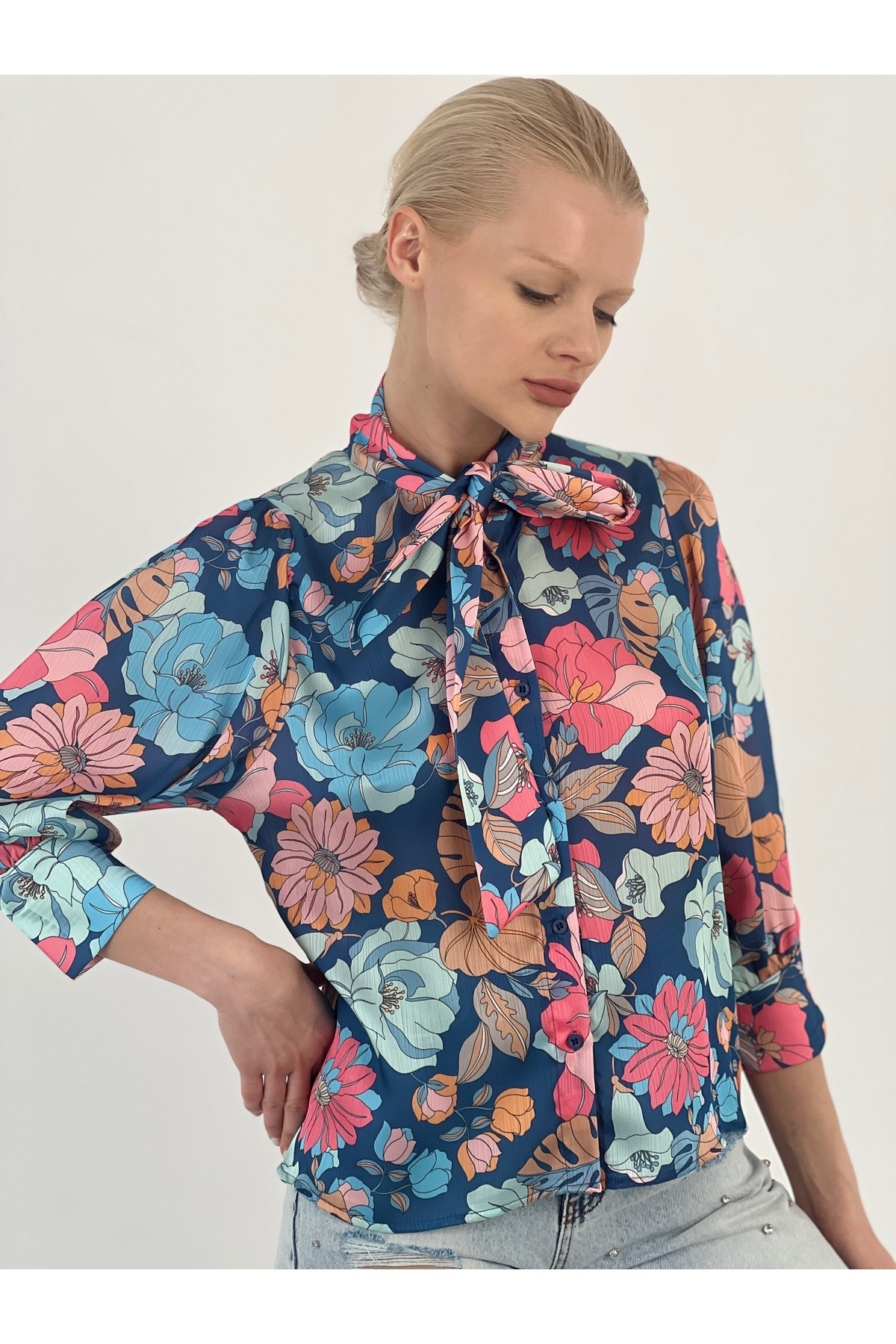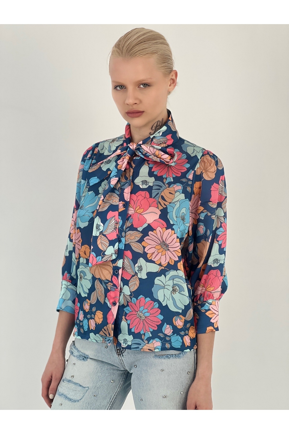 Kadın Yakası Fularlı Desenli Mavi Gömlek Kadın Yakası Fularlı Desenli Mavi Gömlek 27418 L