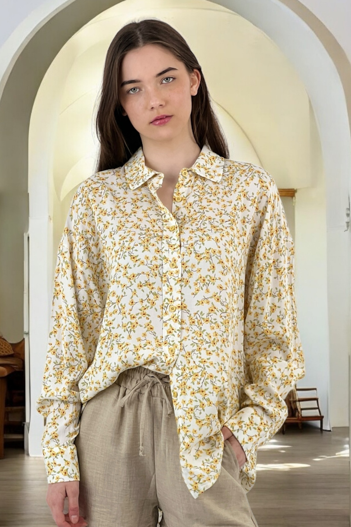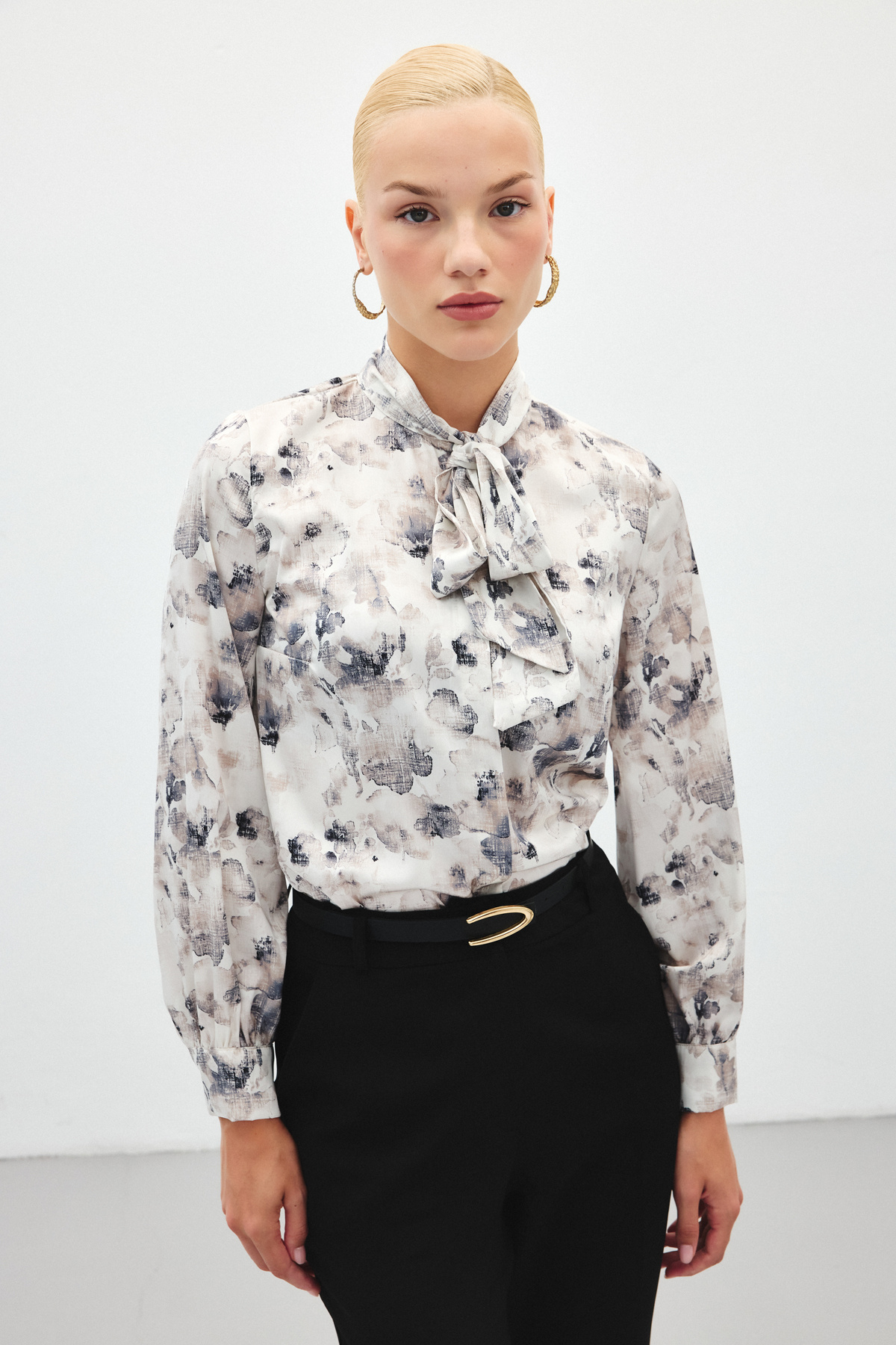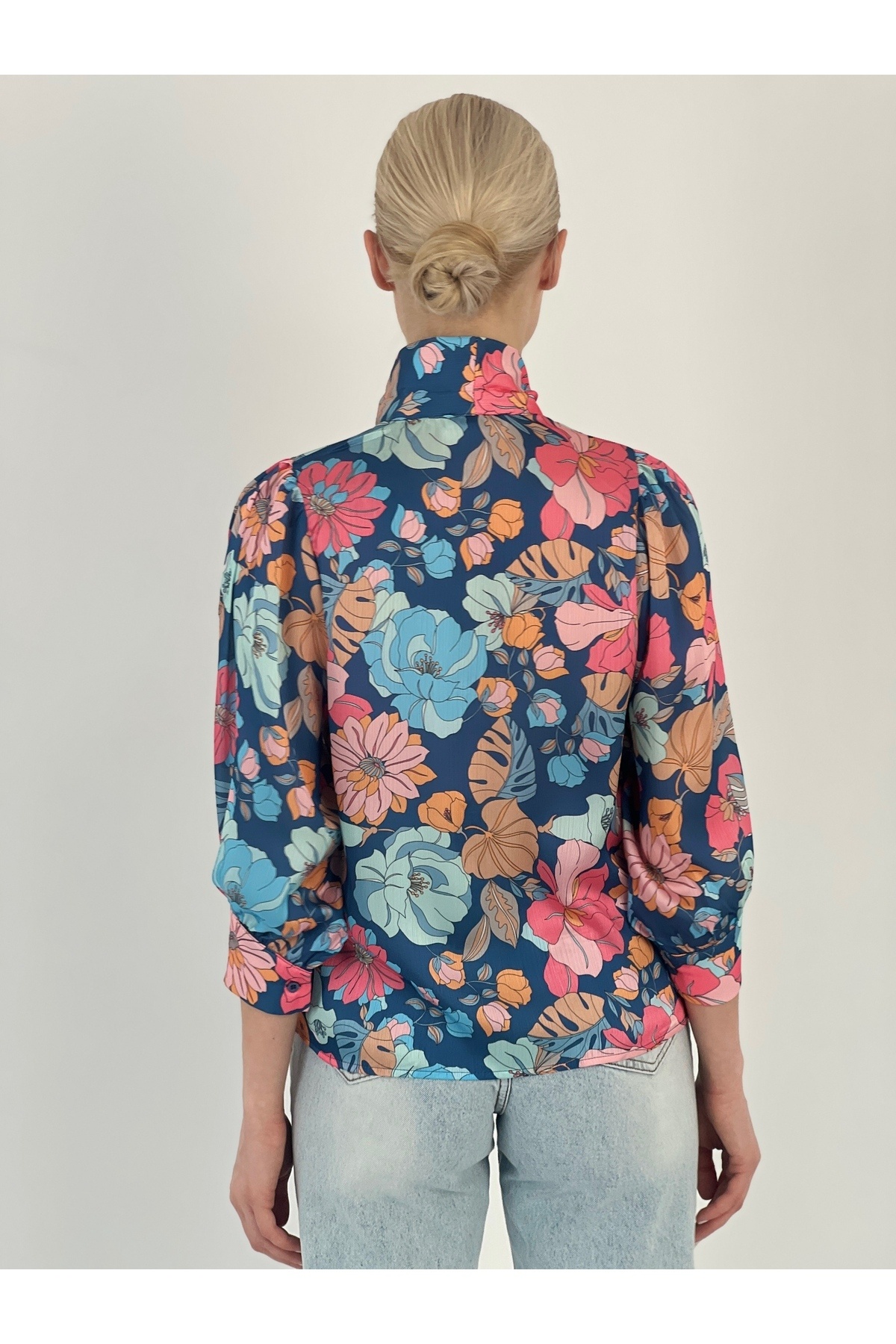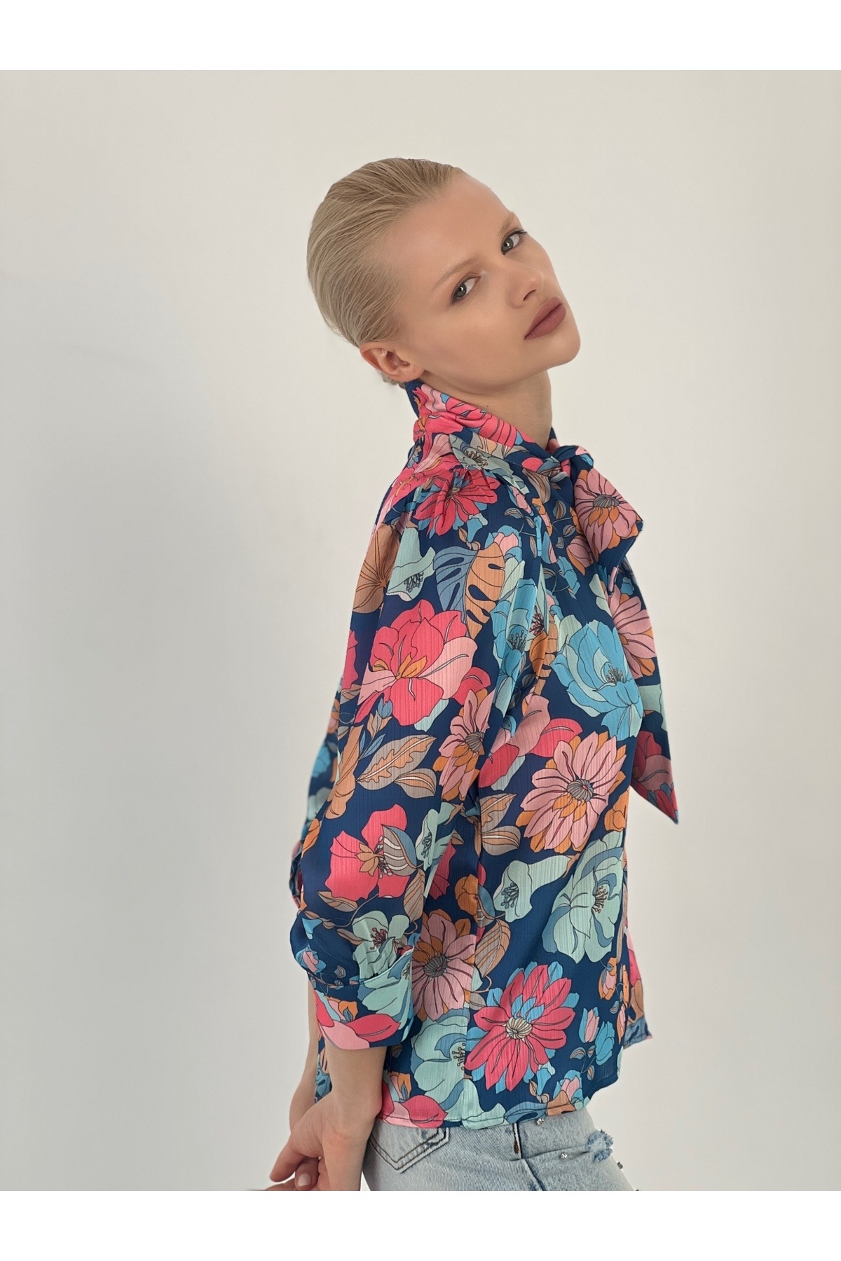 Kadın Yakası Fularlı Desenli Mavi Gömlek Kadın Yakası Fularlı Desenli Mavi Gömlek 27418 L