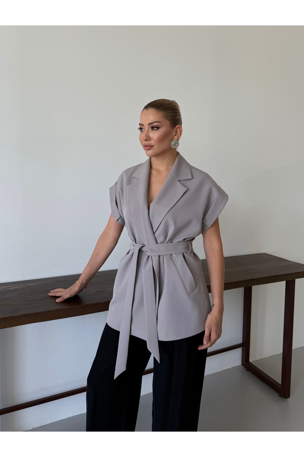 Düşük Kol Oversize Kuşaklı Yelek Düşük Kol Oversize Kuşaklı Yelek yelek2025d XL