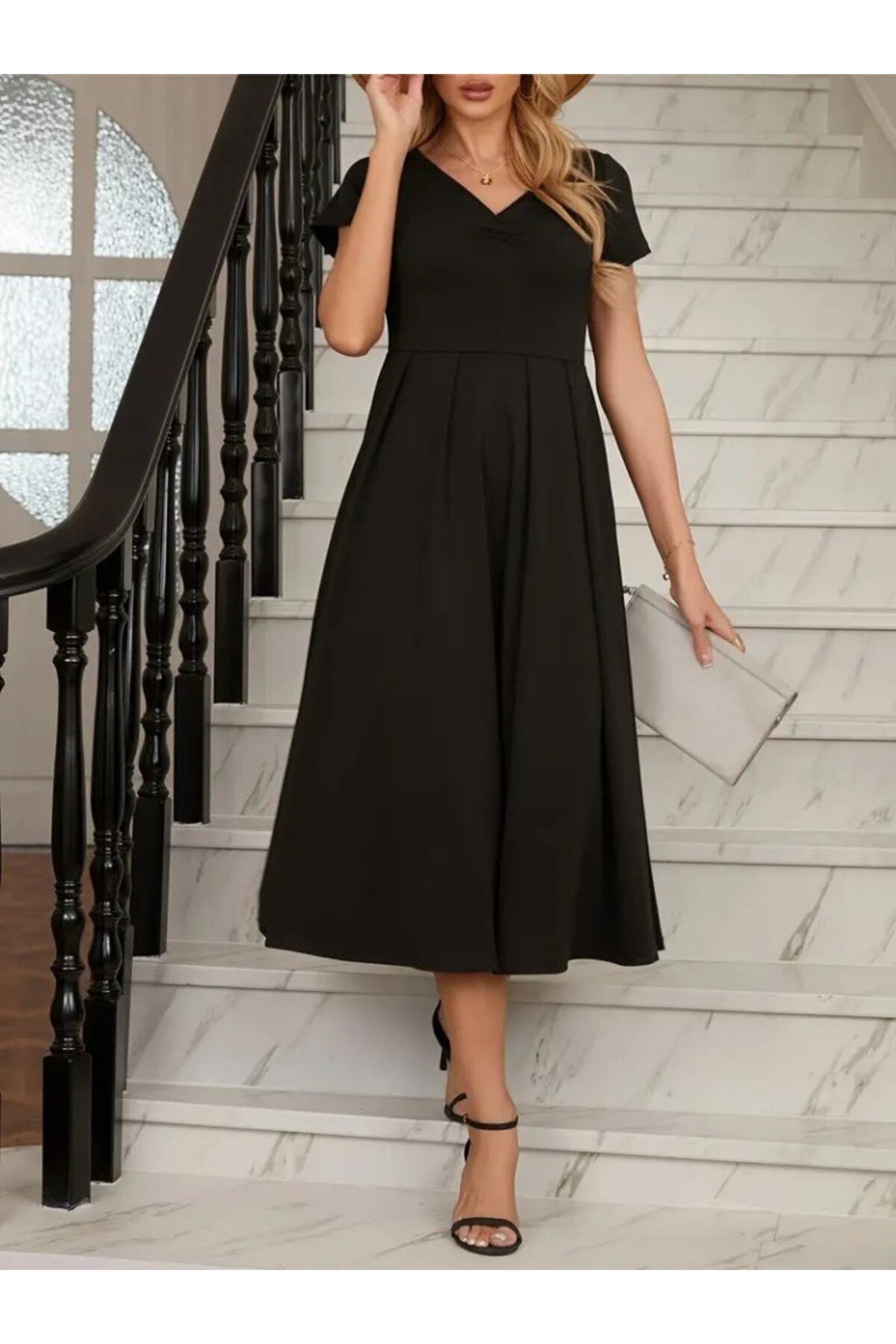 Kadın Kısa Kollu V Yakalı önden Pileli Midi Janjan Krep Elbise Kadın Kısa Kollu V Yakalı önden Pileli Midi Janjan Krep Elbise 164884 2XL-3XL