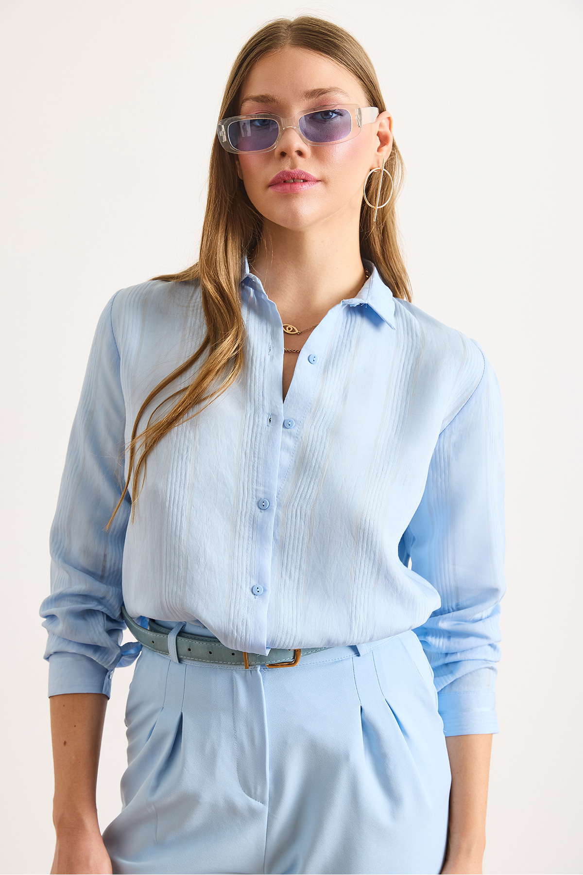 Kadın Bebe Mavi Transparan Şeritli Regular Fit Dökümlü Gömlek GML-19001334 Kadın Bebe Mavi Transparan Şeritli Regular Fit Dökümlü Gömlek GML-19001334 L