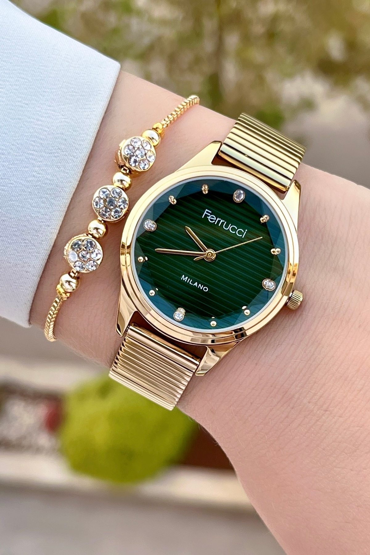 Kadranı Yeşil Kordonu Gold Renk Kadın Kol Saati ve Bileklik Kadranı Yeşil Kordonu Gold Renk Kadın Kol Saati ve Bileklik FCISTEO3395H تک سایز