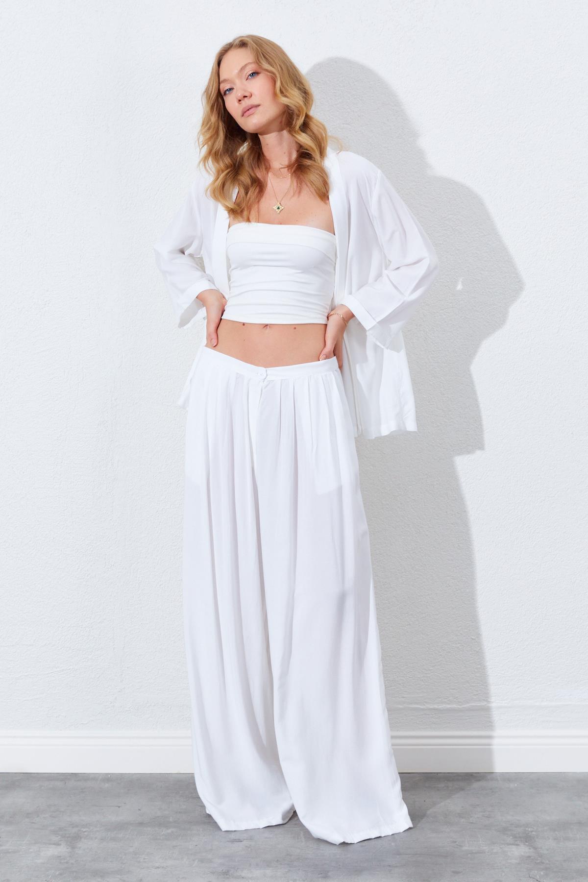 Kadın Naturel Beli Lastikli Palazzo Keten Pantolon Kadın Naturel Beli Lastikli Palazzo Keten Pantolon 5YKP66-1841 L