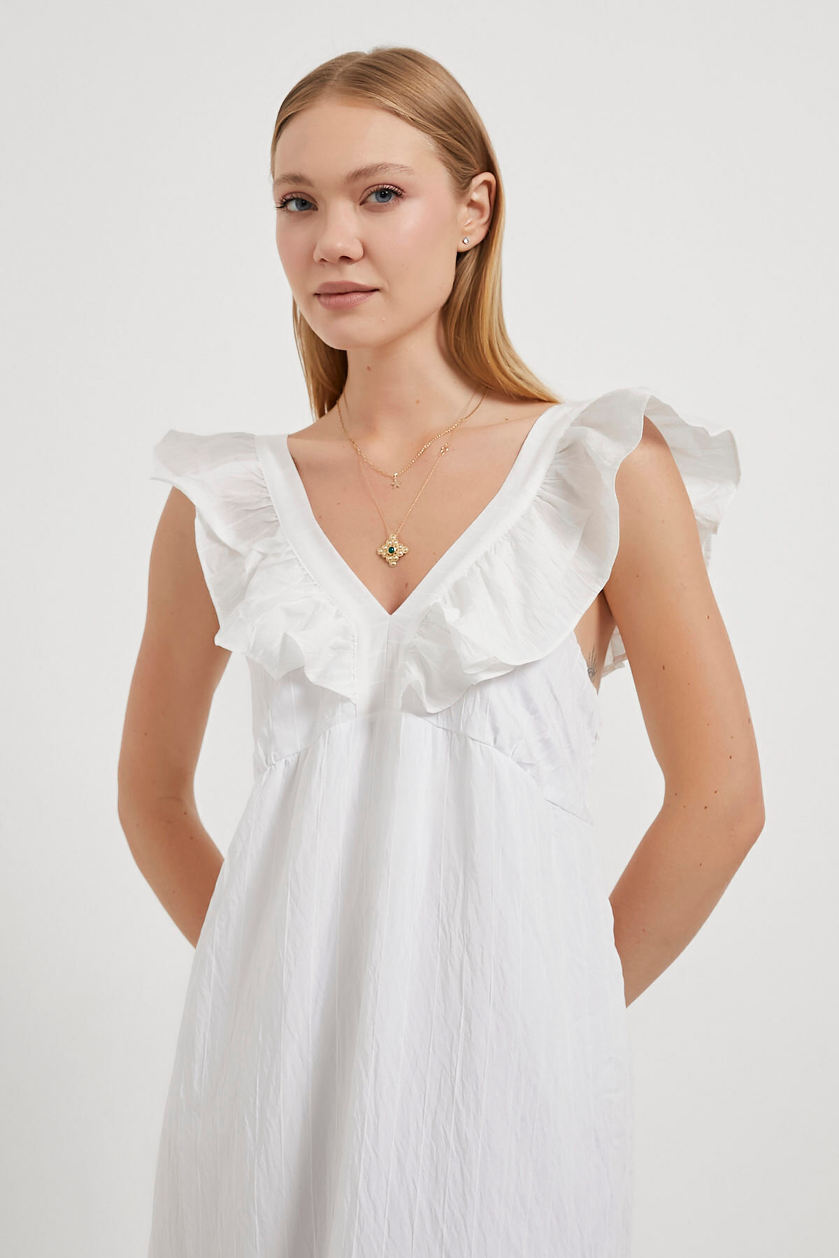 Kadın Fırfırlı V Yaka Kolsuz Bol Beyaz Uzun Elbise Kadın Fırfırlı V Yaka Kolsuz Bol Beyaz Uzun Elbise 532-5YB4590ELB XL