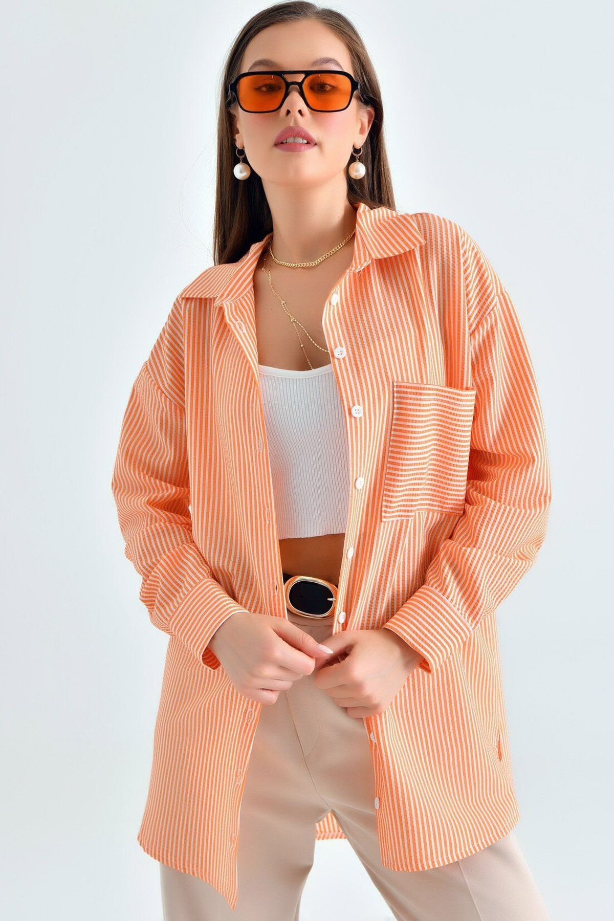 Oversize Pamuklu Boyuna Çizgili Gömlek Turuncu Oversize Pamuklu Boyuna Çizgili Gömlek Turuncu MDN8V4SCZM Standart