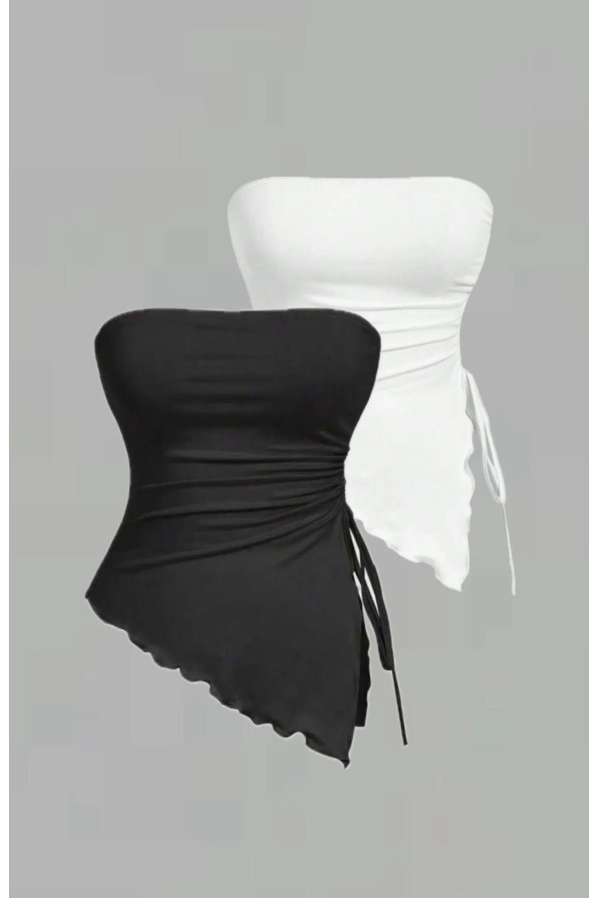2'li Siyah Beyaz Asimetrik Yan Büzgülü Esnek Yazlık Bluz, Büzgülü Siyah Beyaz Likralı Straplez 2'li Siyah Beyaz Asimetrik Yan Büzgülü Esnek Yazlık Bluz, Büzgülü Siyah Beyaz Likralı Straplez YAZLIK-P01 L