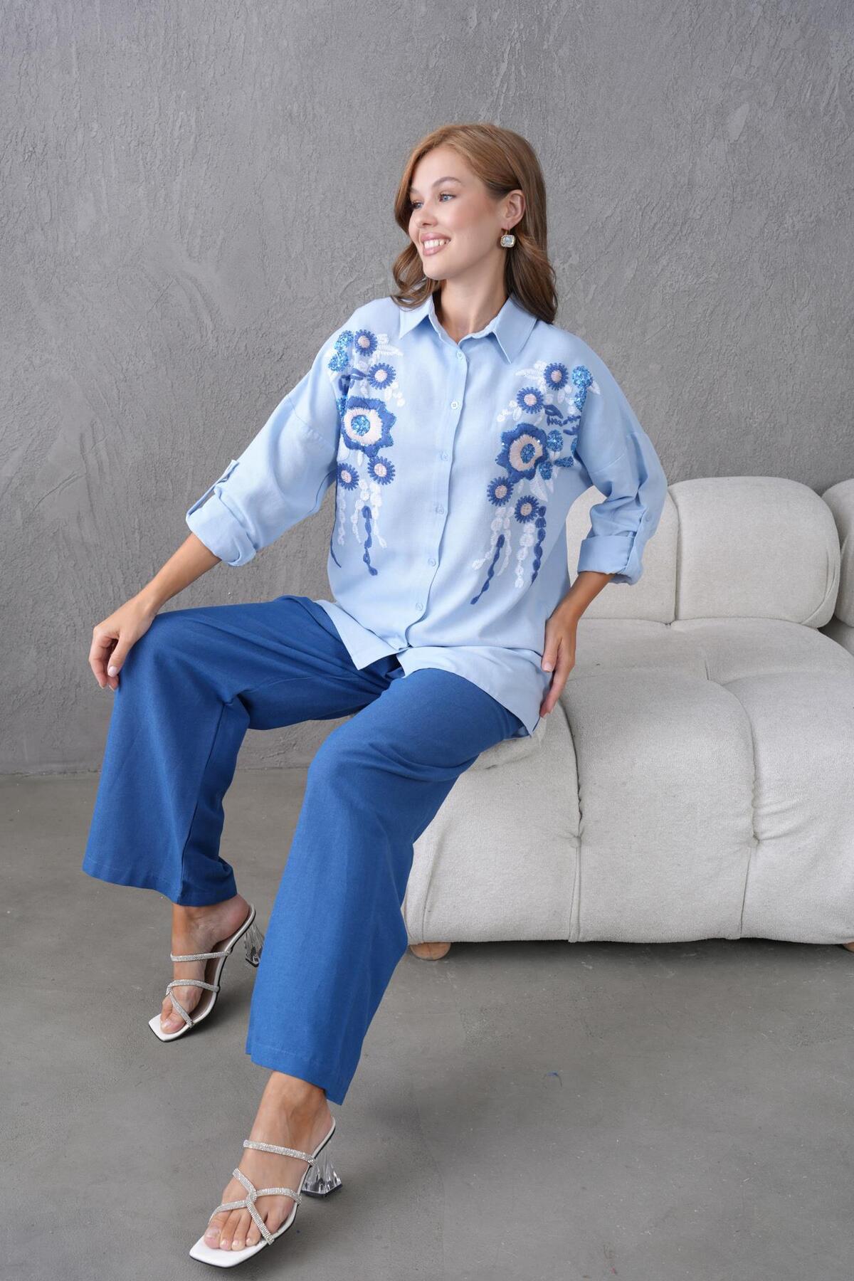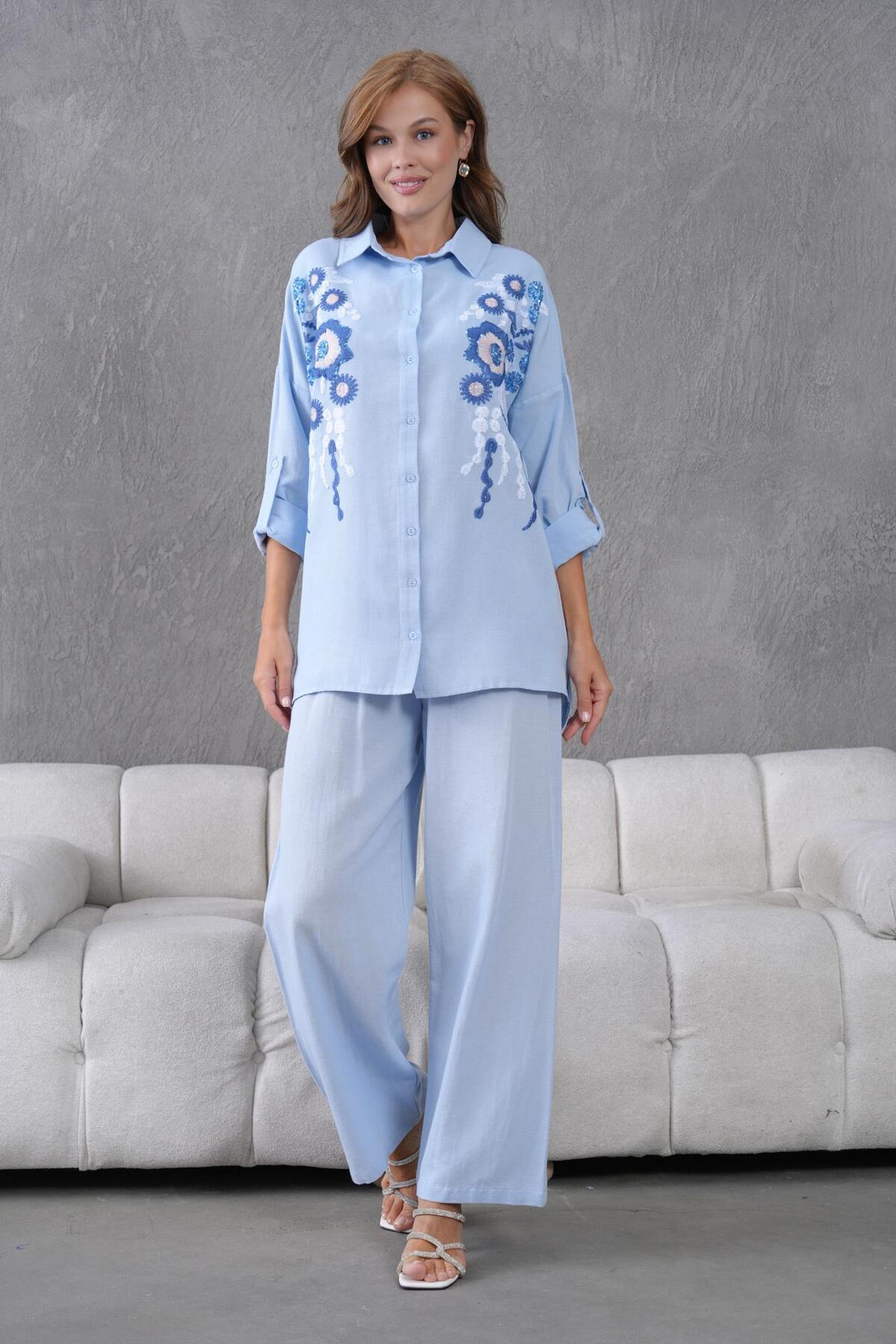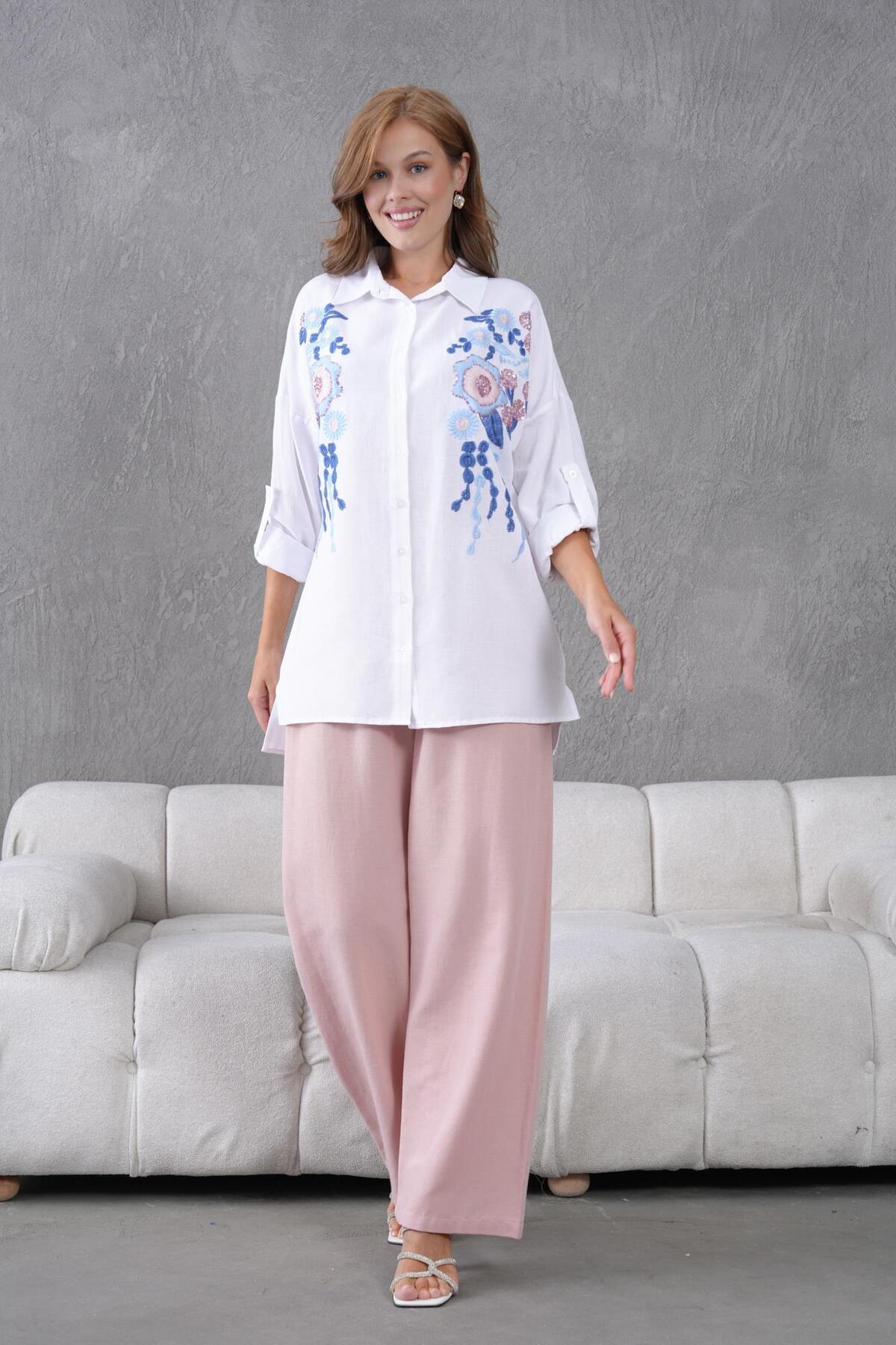 NAKIŞ İŞLEMELİ TAŞLI KETEN TAKIM NAKIŞ İŞLEMELİ TAŞLI KETEN TAKIM 117443 XL