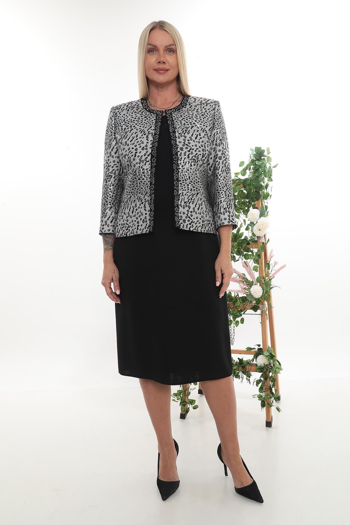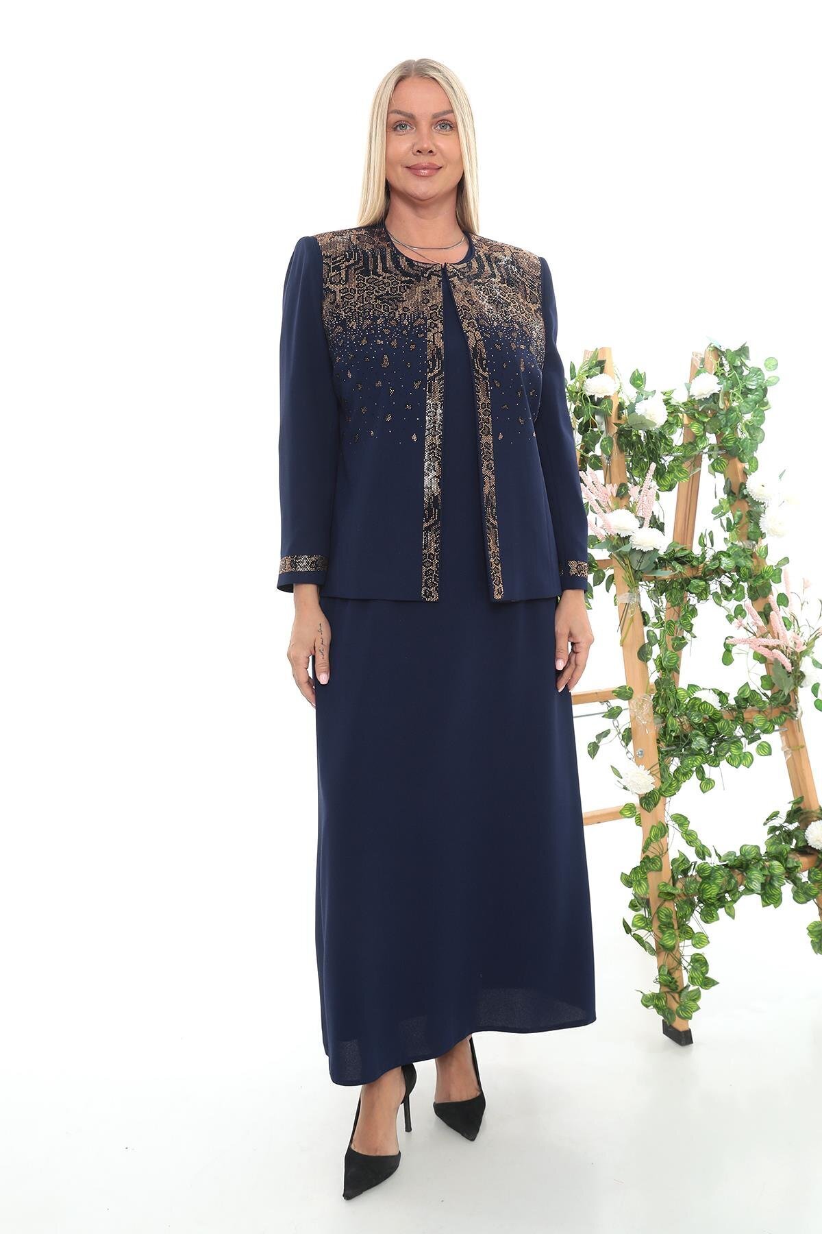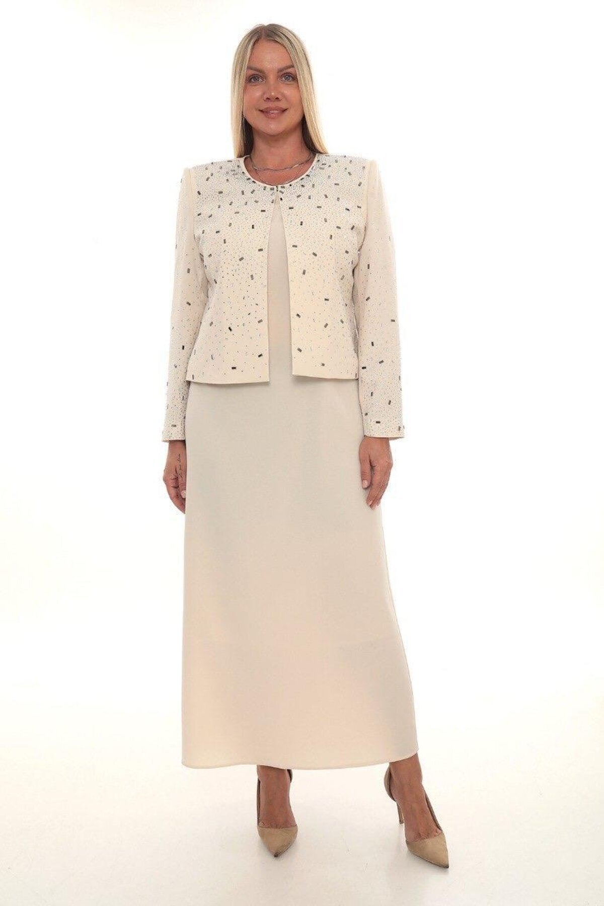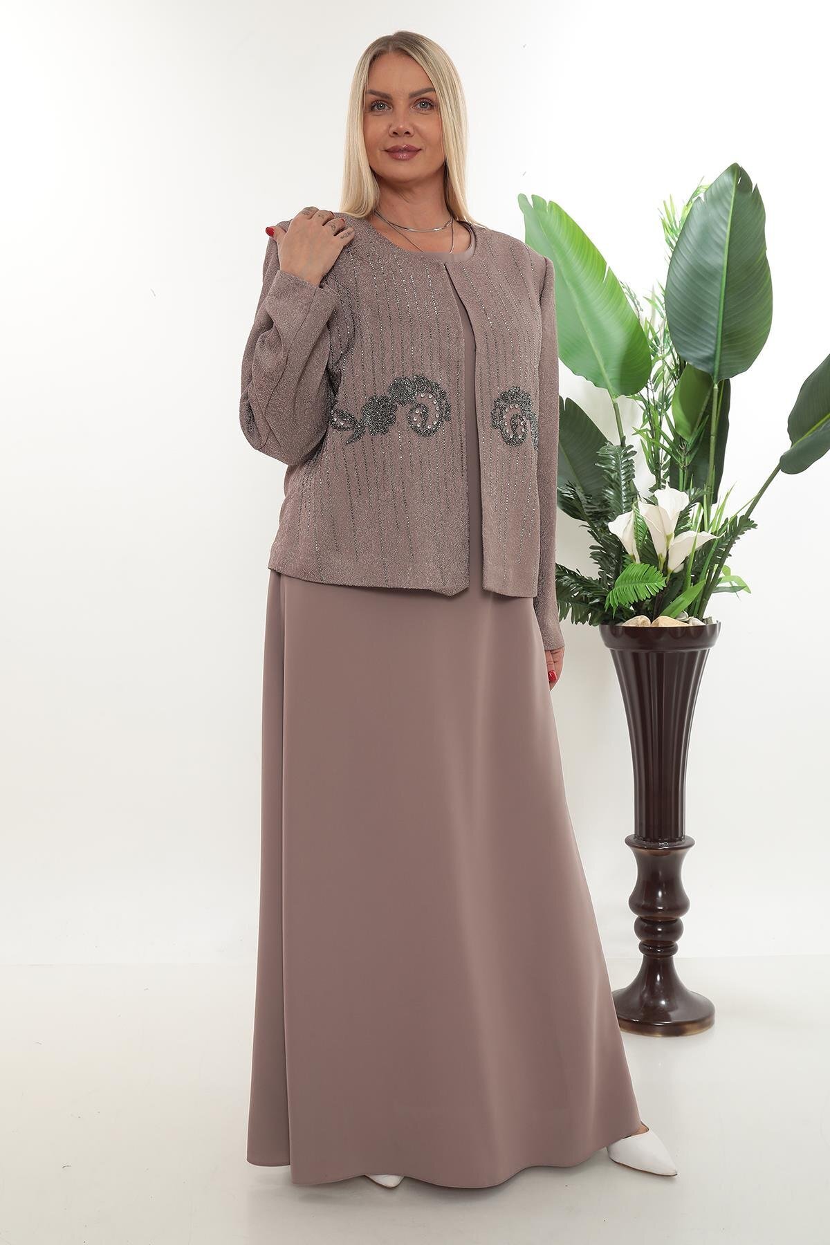 Büyük Beden Astarlı Taşlı Bej Ceket Elbise Büyük Beden Astarlı Taşlı Bej Ceket Elbise 08520B 48