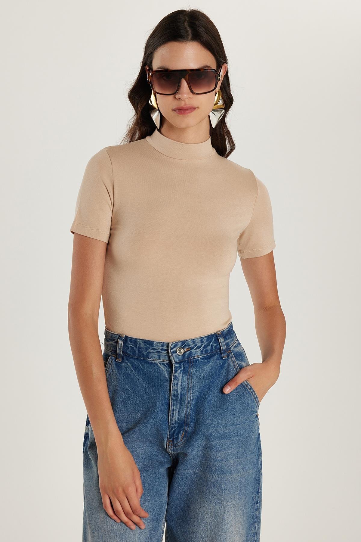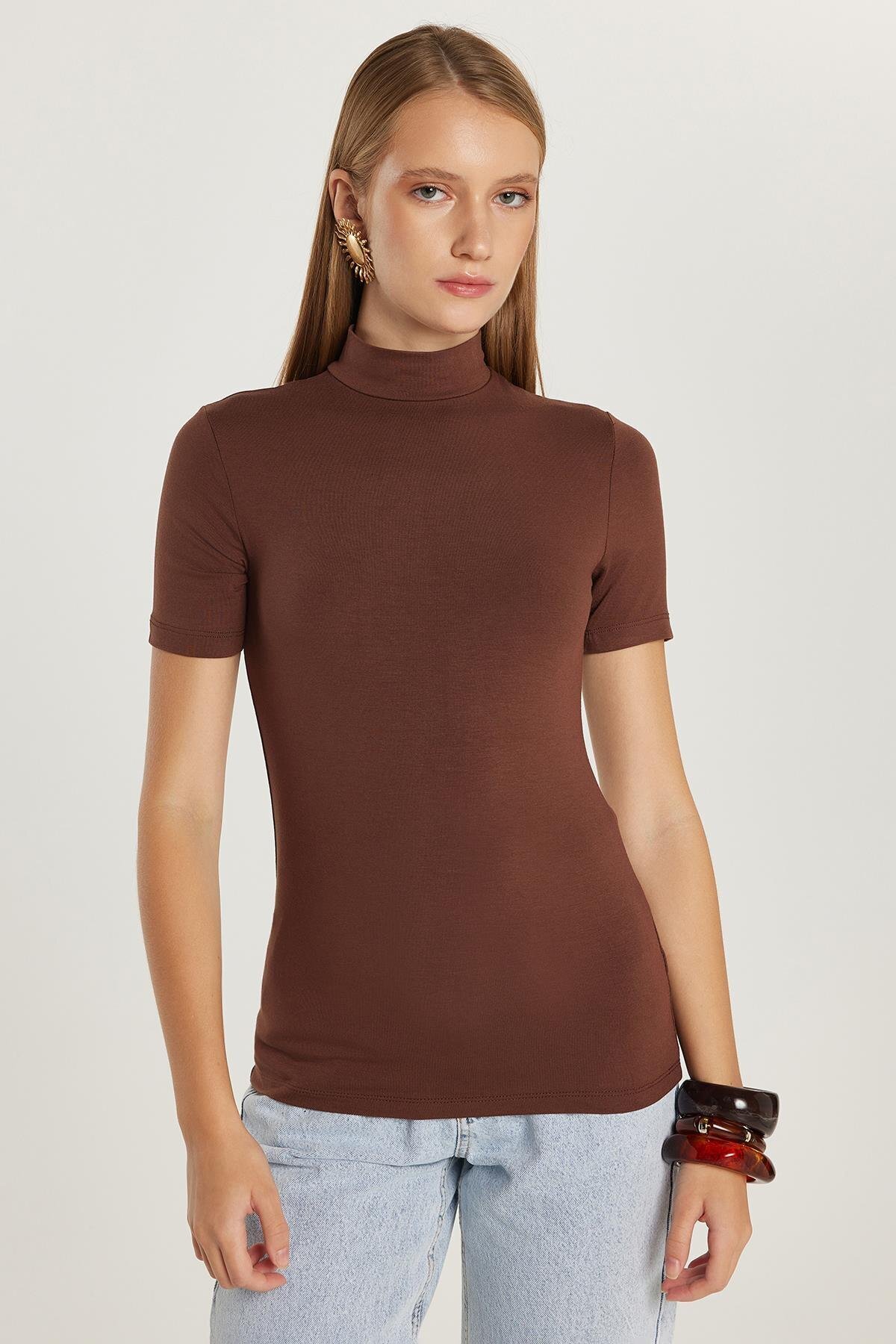 Kadın Standart Fit Kısa Kollu Yarım Balıkçı Yaka Kahverengi Bluz Kadın Standart Fit Kısa Kollu Yarım Balıkçı Yaka Kahverengi Bluz BYGM2545 2XL