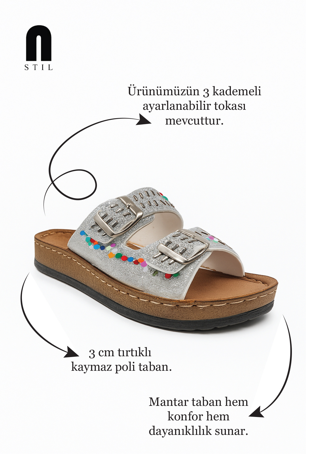 Günlük Kadın Gümüş Terlik Çift Tokalı Taşlı Boncuk Detaylı Dikişli Ortopedik Mantar Taban 34155 Günlük Kadın Gümüş Terlik Çift Tokalı Taşlı Boncuk Detaylı Dikişli Ortopedik Mantar Taban 34155 PRA-12828731-070760 40