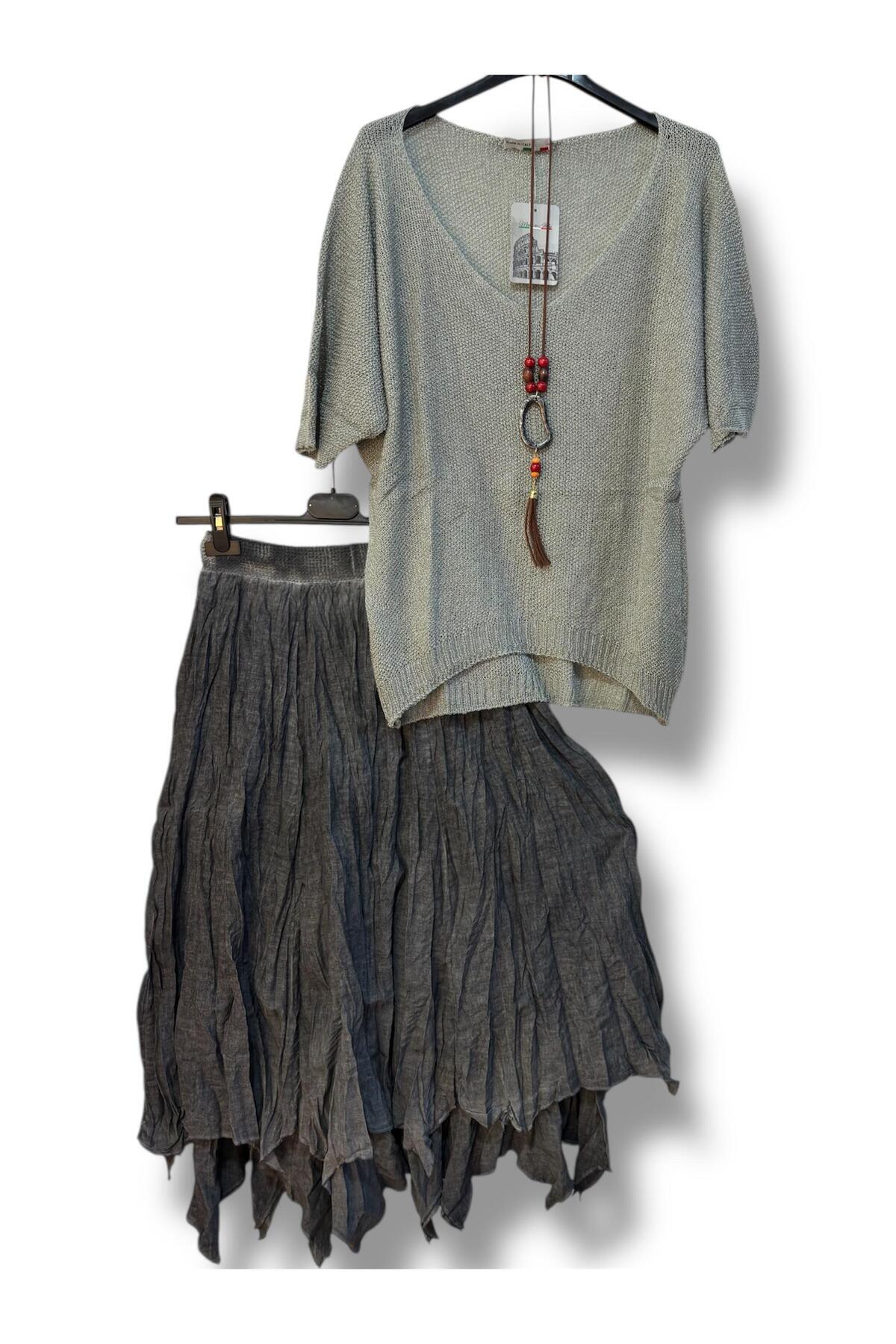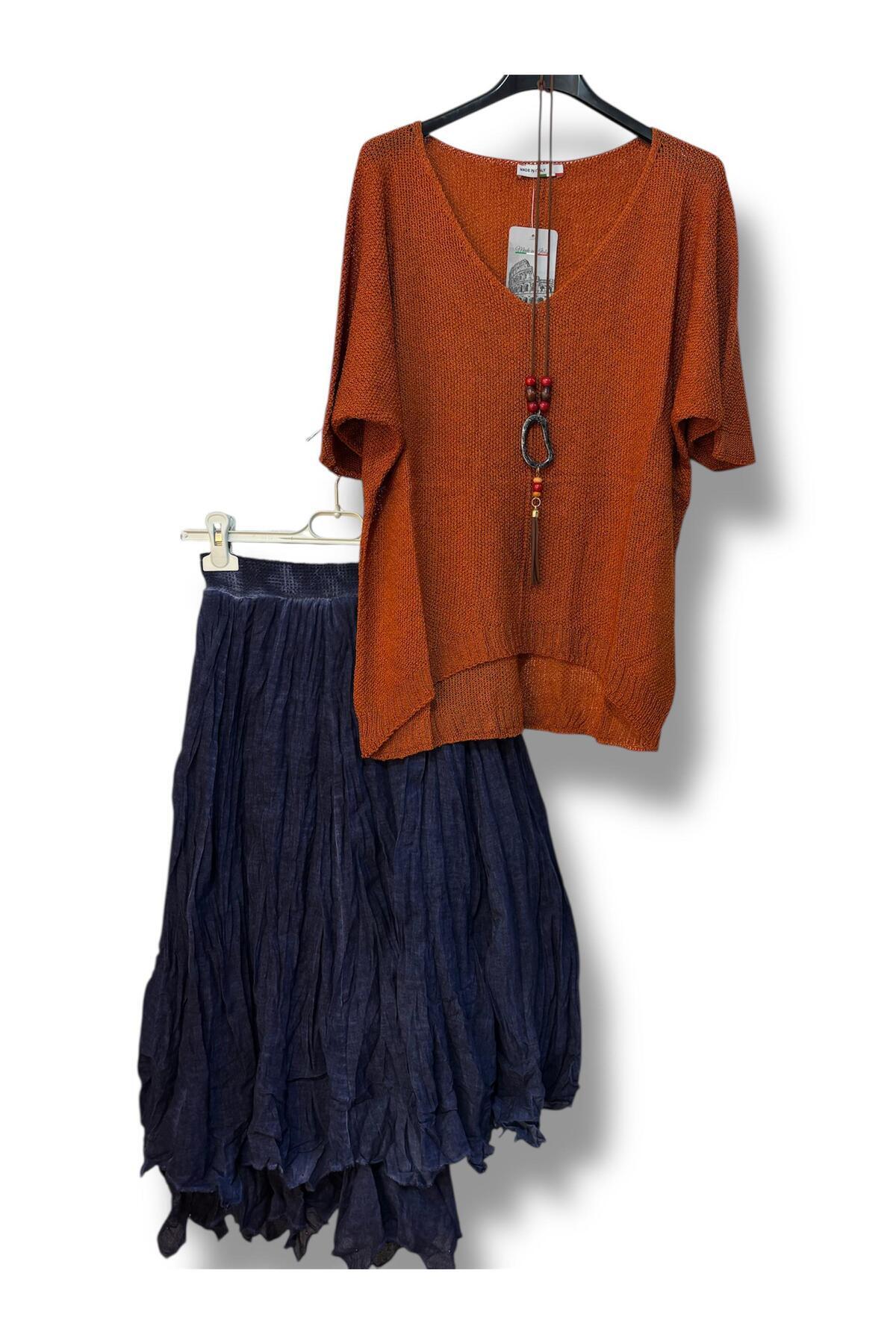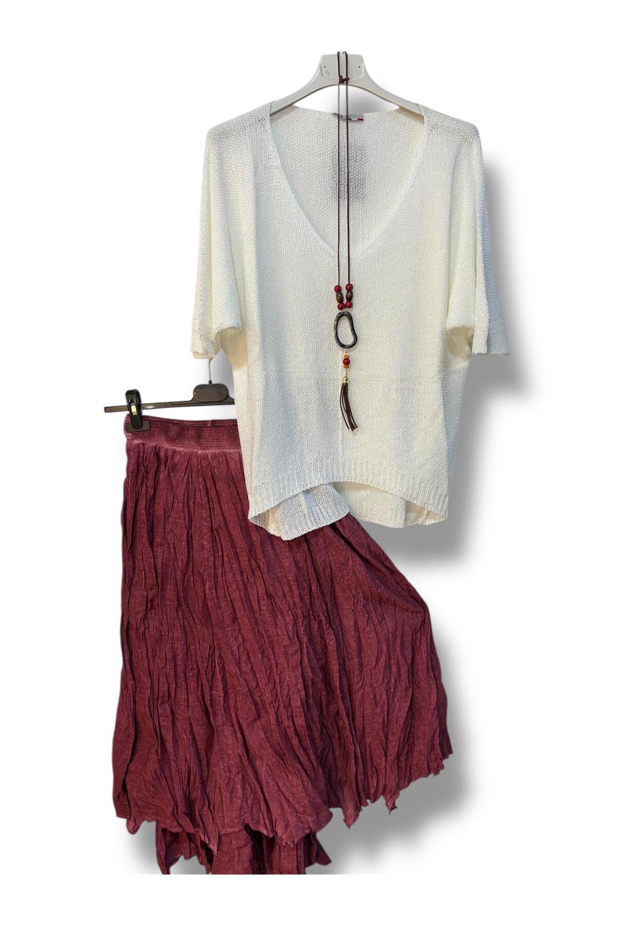 Kadın Pamuklu Astarlı Etek Ve Kolyeli Merserize Bluz Kombin Kadın Pamuklu Astarlı Etek Ve Kolyeli Merserize Bluz Kombin KOMBİN009223 Standart