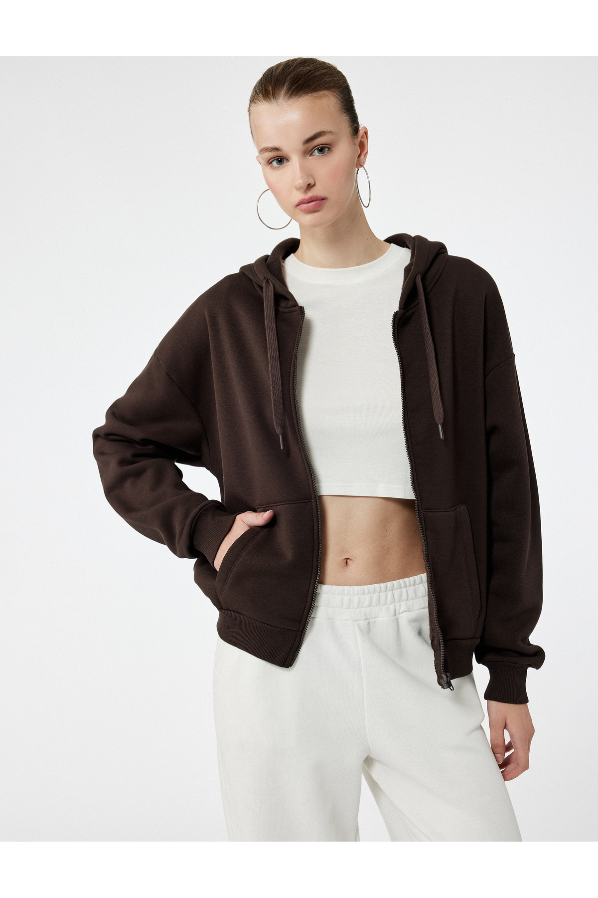 Şardonlu Uzun Kollu Kapüşonlu Kanguru Cepli Oversize Fermuarlı Sweatshirt Şardonlu Uzun Kollu Kapüşonlu Kanguru Cepli Oversize Fermuarlı Sweatshirt 6WAL10130IK Standart