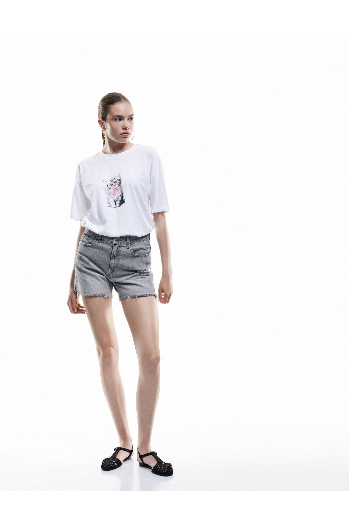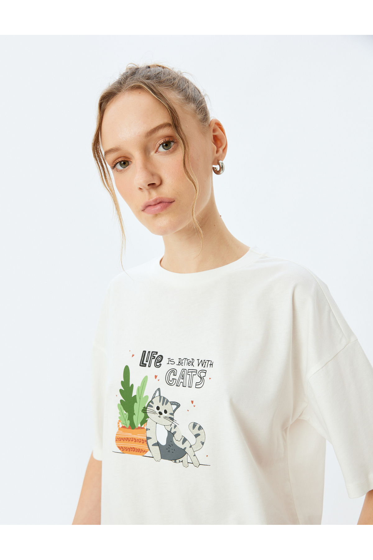 Kısa Kollu Bisiklet Yaka Pamuklu Kedi Baskılı Oversize Tişört Kısa Kollu Bisiklet Yaka Pamuklu Kedi Baskılı Oversize Tişört 6WAL10337IK 2XL