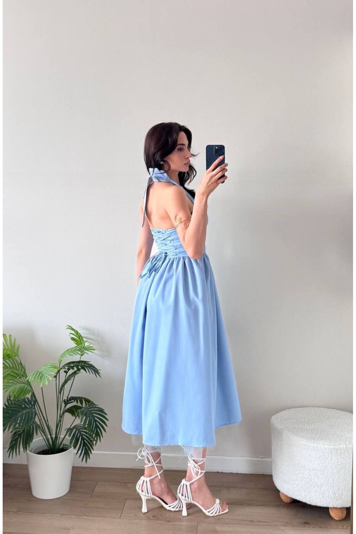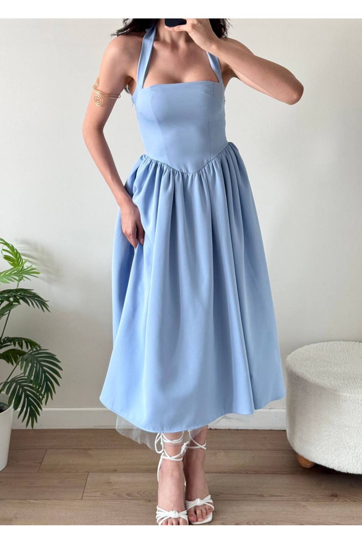 Kadın Mavi Astarı Uzun Tüllü Boyun Bağlamalı Midi Elbise Kadın Mavi Astarı Uzun Tüllü Boyun Bağlamalı Midi Elbise 2622 L