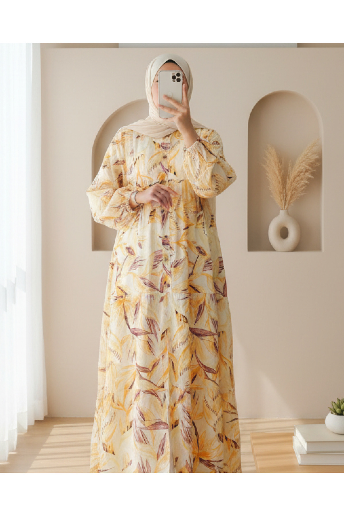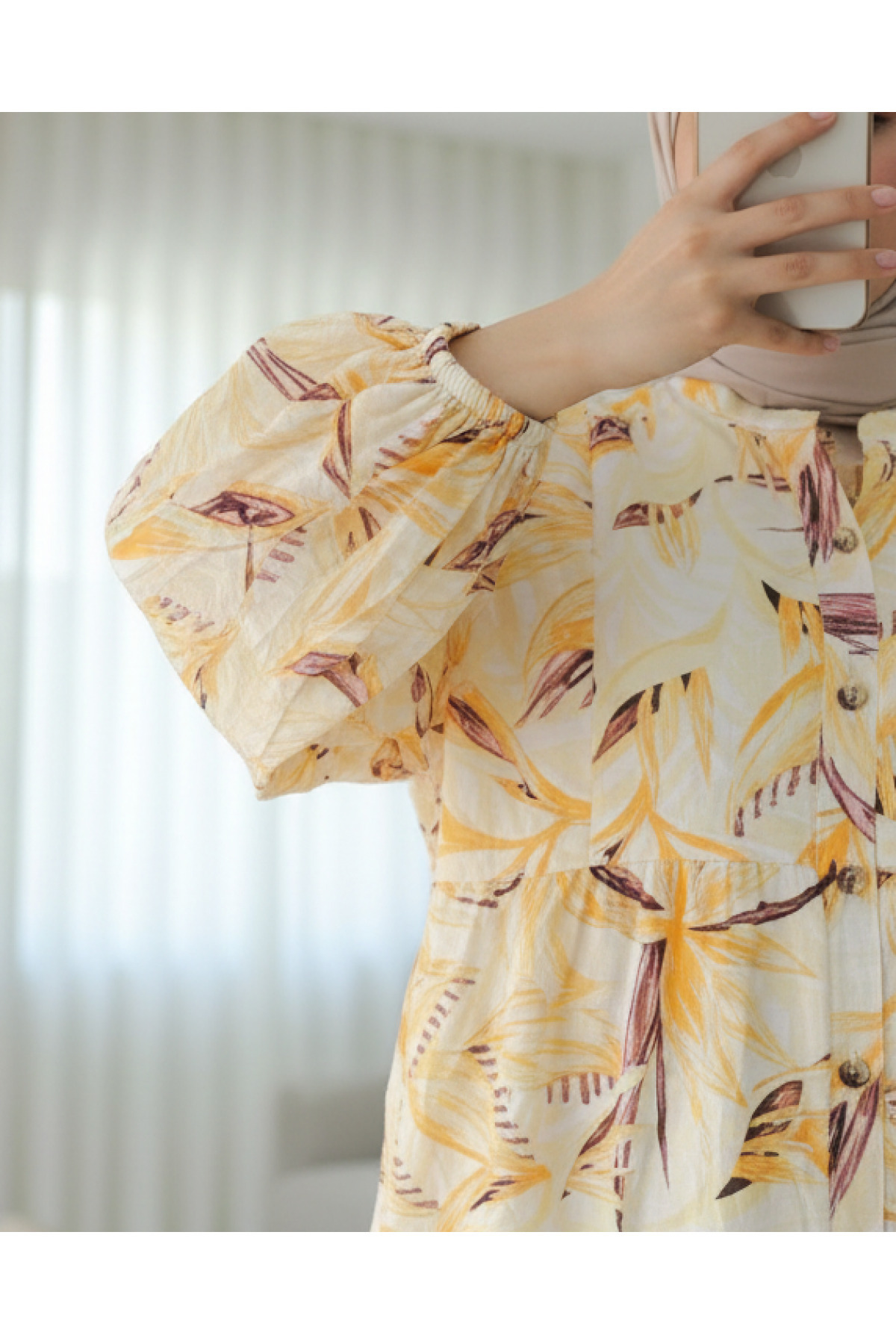 Çiçek Desenli Parçalı Kolu Lastikli Yarım Düğmeli Elbise -Hardal Çiçek Desenli Parçalı Kolu Lastikli Yarım Düğmeli Elbise -Hardal TY197-67863 48