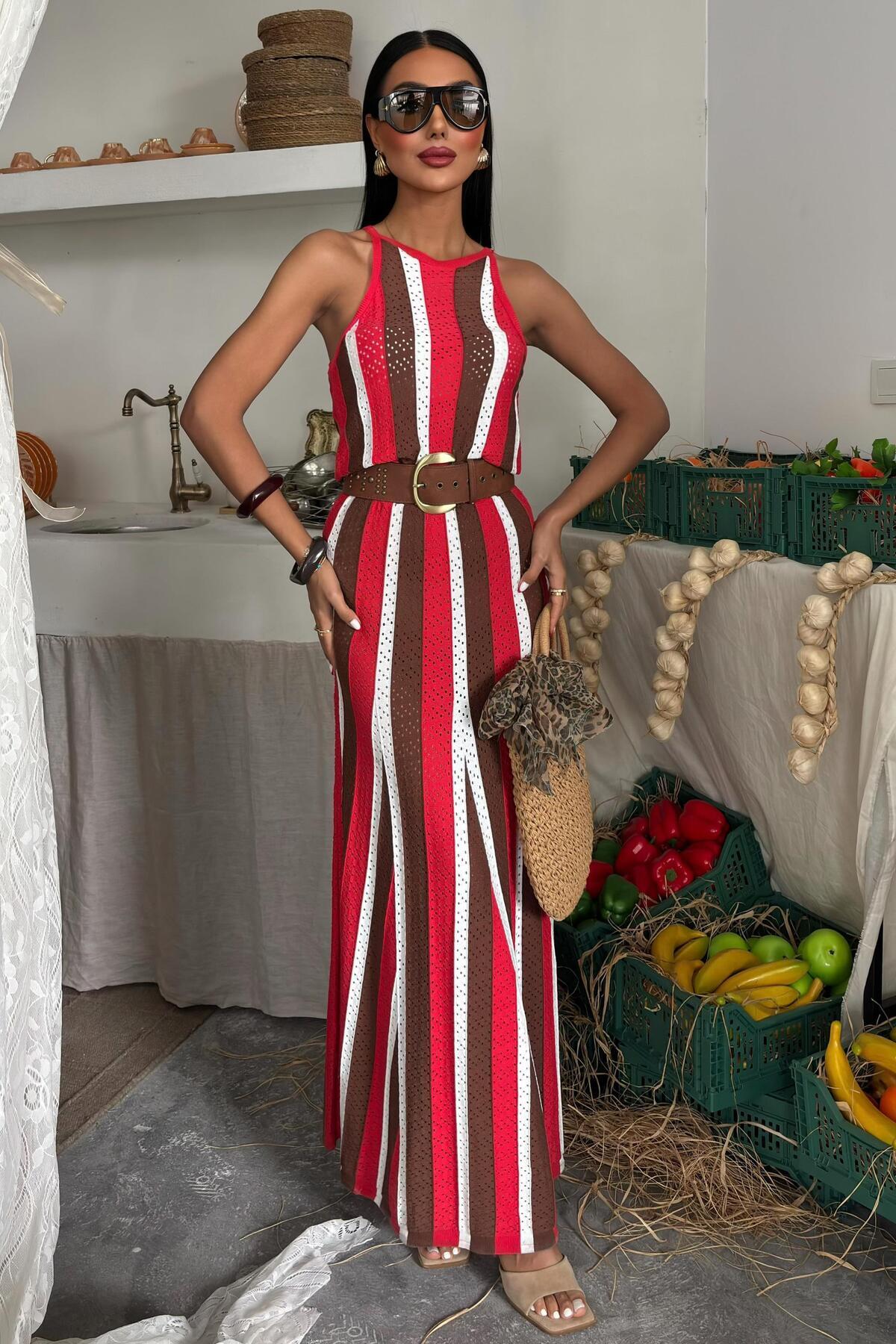 Kadın Narçiçeği Çizgili Uzun Dokuma Kolsuz Elbise Kadın Narçiçeği Çizgili Uzun Dokuma Kolsuz Elbise S4Y2763 Standart