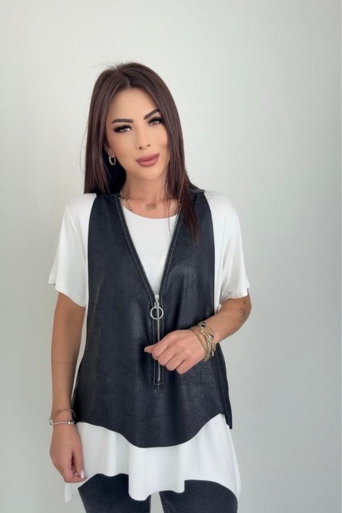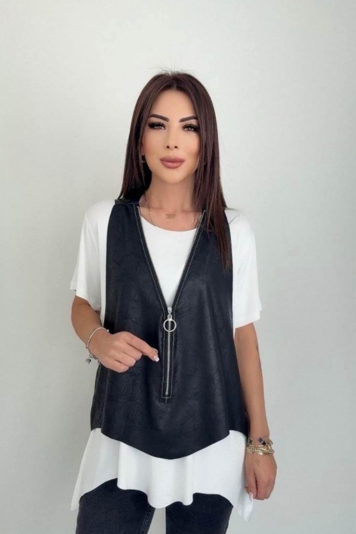 Yeni Sezon Kadın Kısa Kollu Yuvarlak Yaka Viskon Bluz + Kolsuz Fermuarlı Çatlak Deri Yelek Yeni Sezon Kadın Kısa Kollu Yuvarlak Yaka Viskon Bluz + Kolsuz Fermuarlı Çatlak Deri Yelek SNN-163415 2XL-3XL