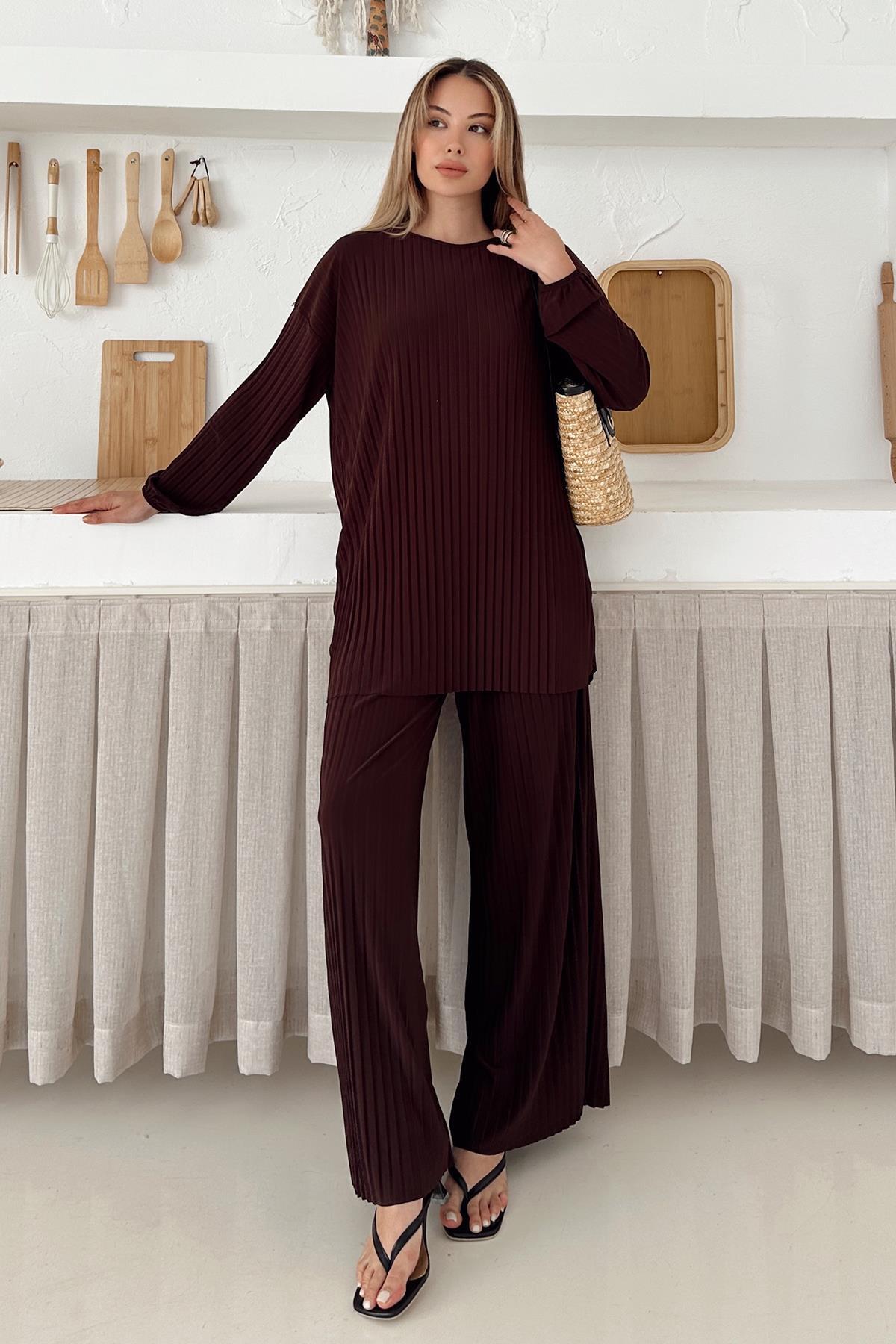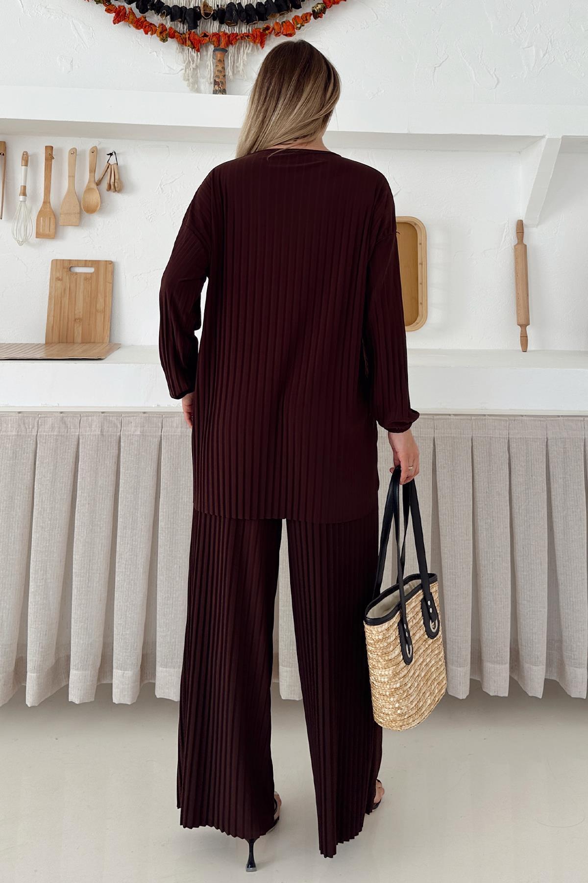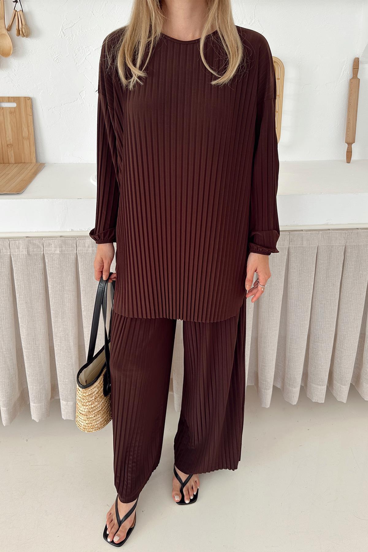 Sandy Kumaş Pliseli Tunik Pantolon İkili Takım KAHVE 9361-TK Sandy Kumaş Pliseli Tunik Pantolon İkili Takım KAHVE 9361-TK تک سایز