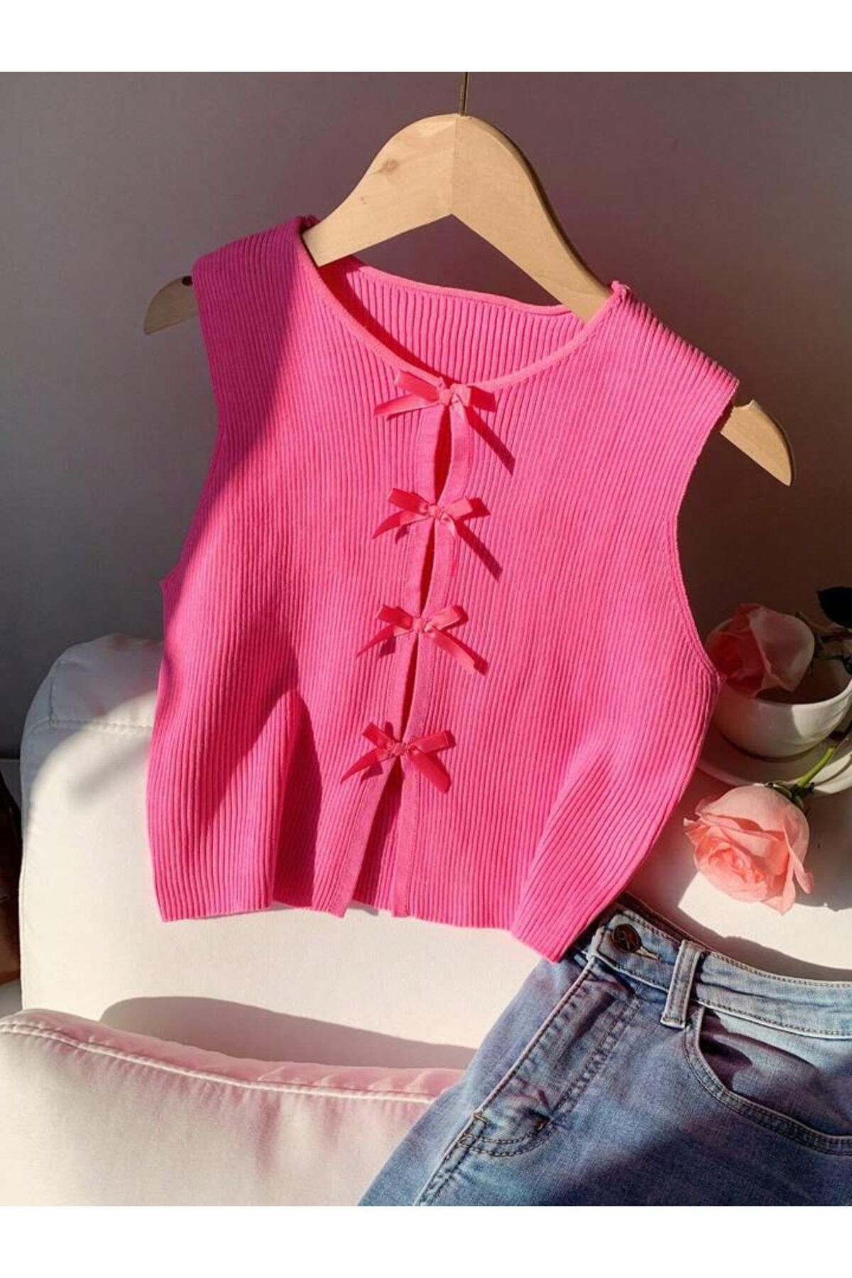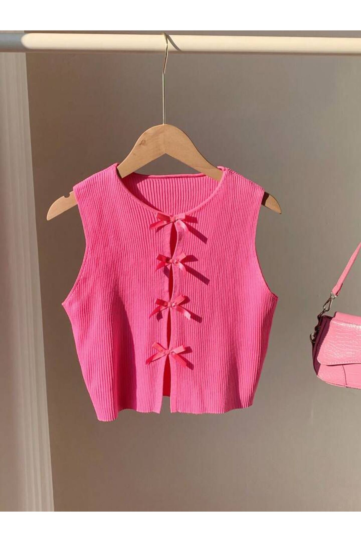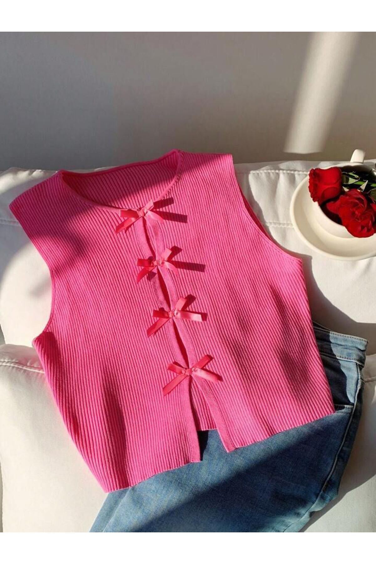 Kadın Pembe Kurdela Detaylı Triko yelek Kadın Pembe Kurdela Detaylı Triko yelek T01 تک سایز