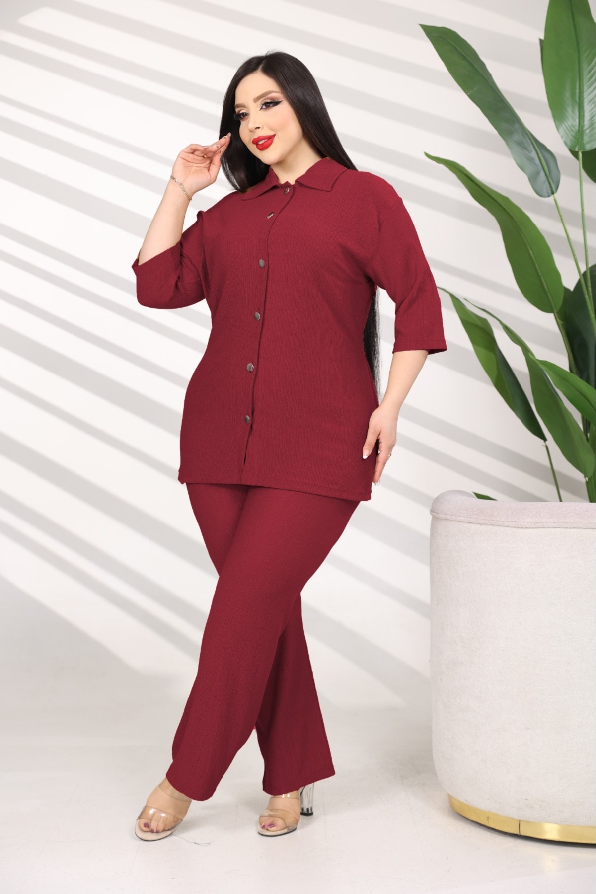BÜRÜMCÜK DÜĞMELİ YAKALI VE KEMERLİ GENİŞ PANTALON TAKIMI BÜRÜMCÜK DÜĞMELİ YAKALI VE KEMERLİ GENİŞ PANTALON TAKIMI BDPT 5XL