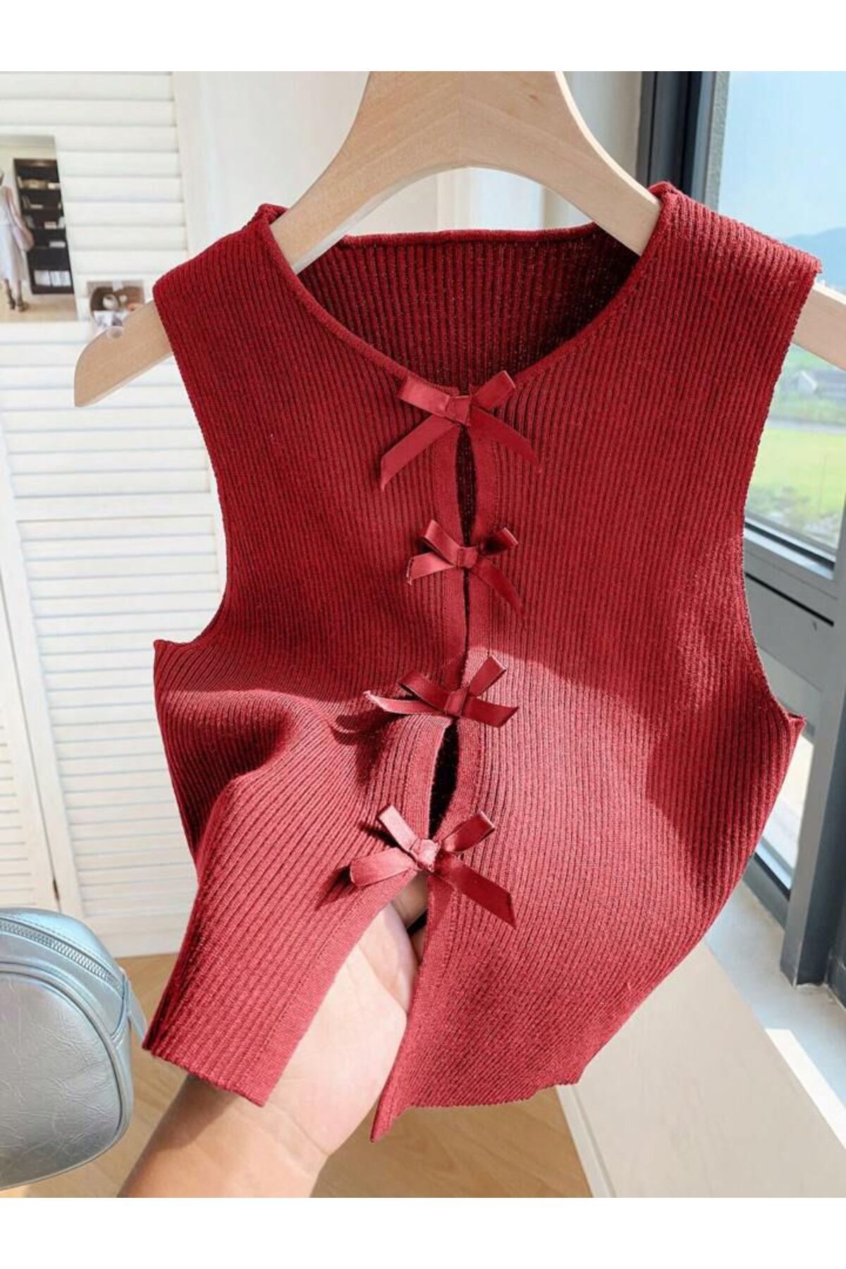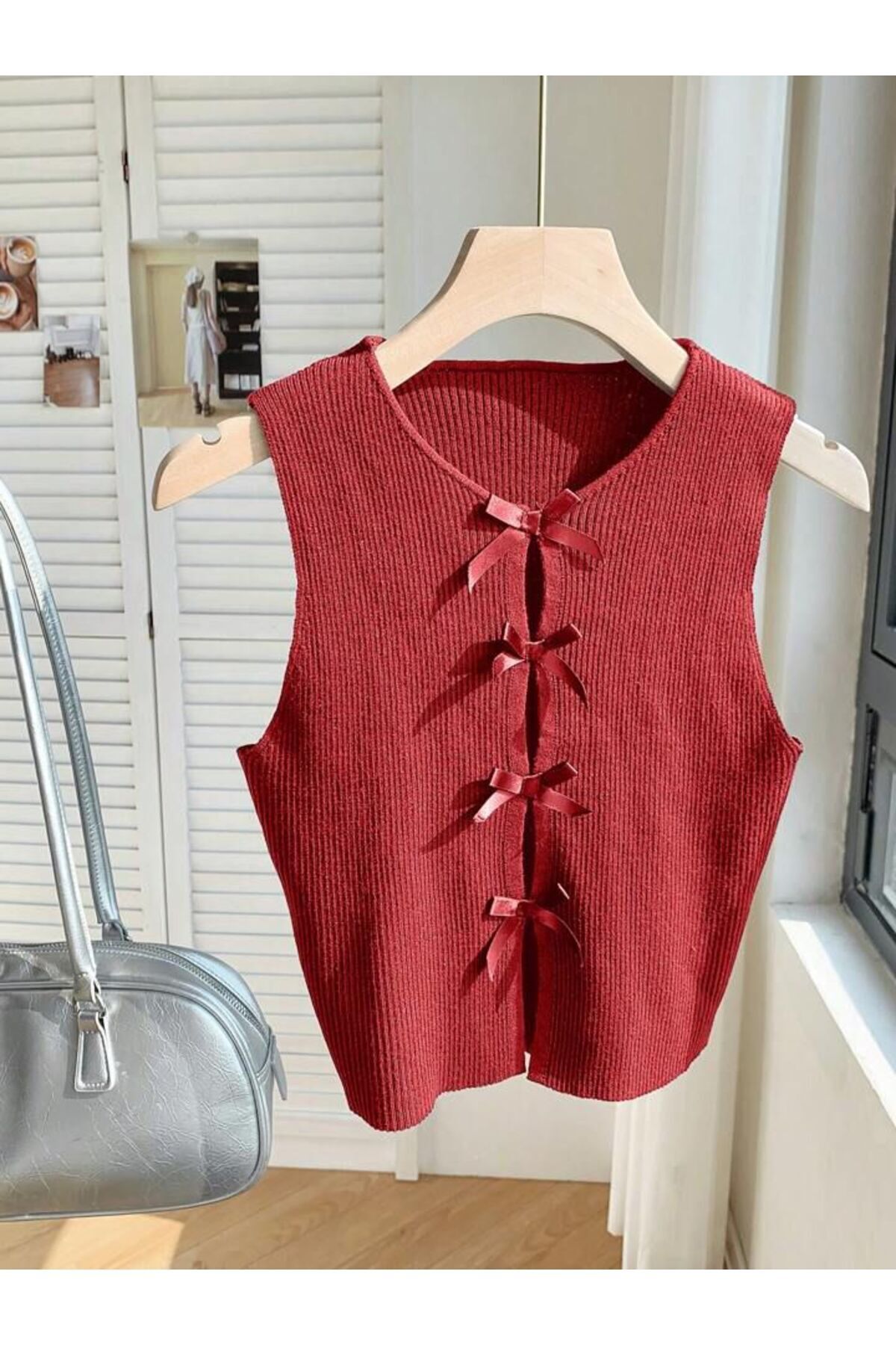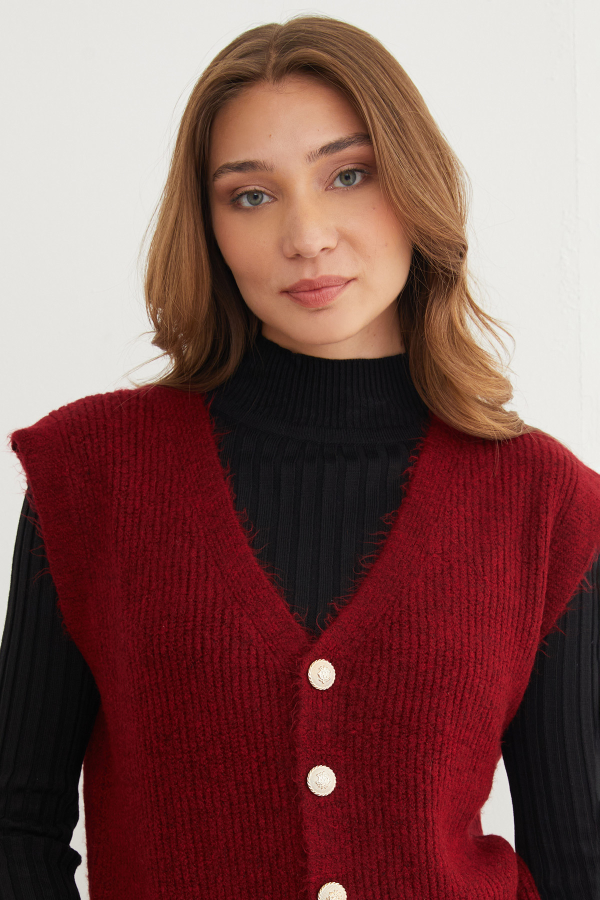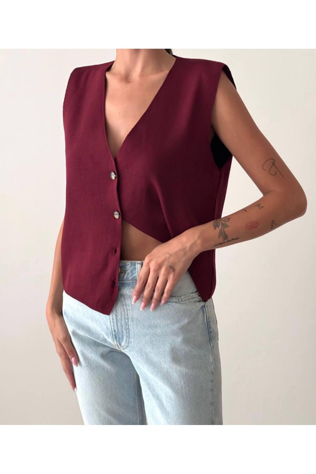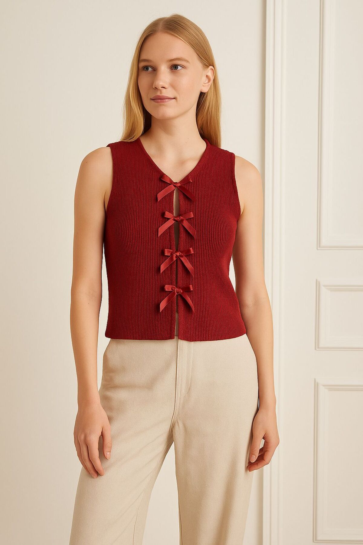 Bordo Kadın Kurdela Detaylı Triko yelek Bordo Kadın Kurdela Detaylı Triko yelek T01 تک سایز