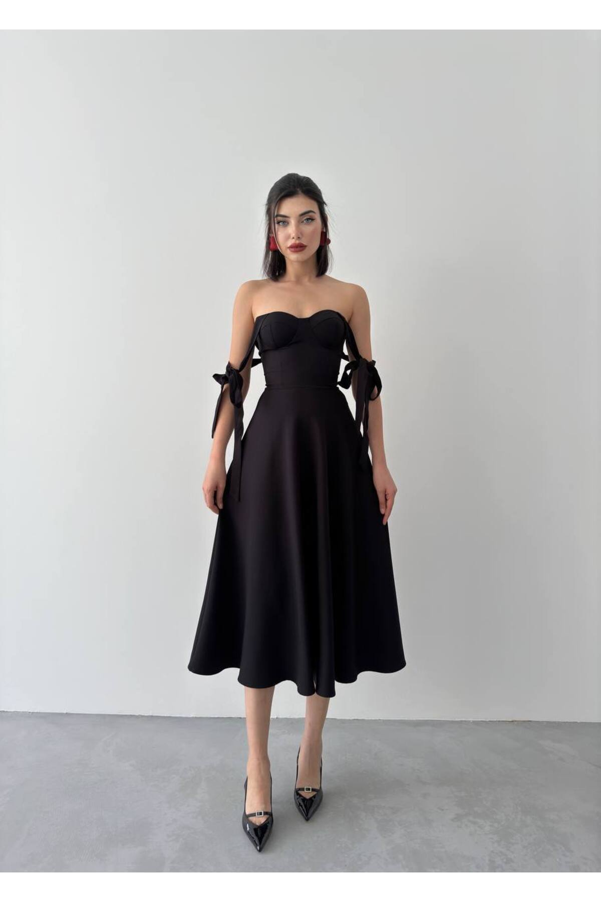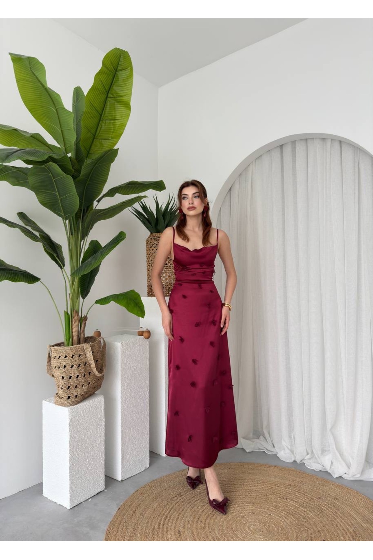 Tasarım Saten Degaje Yaka Çiçek Detaylı Askılı Kadın Elbise Tasarım Saten Degaje Yaka Çiçek Detaylı Askılı Kadın Elbise YUR00122 L