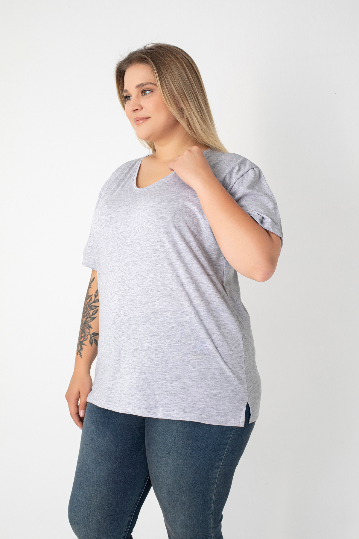 Yırtmaçlı Pamuklu Kadın V Yaka Büyük Beden T-shirt Yırtmaçlı Pamuklu Kadın V Yaka Büyük Beden T-shirt 5900 4XL