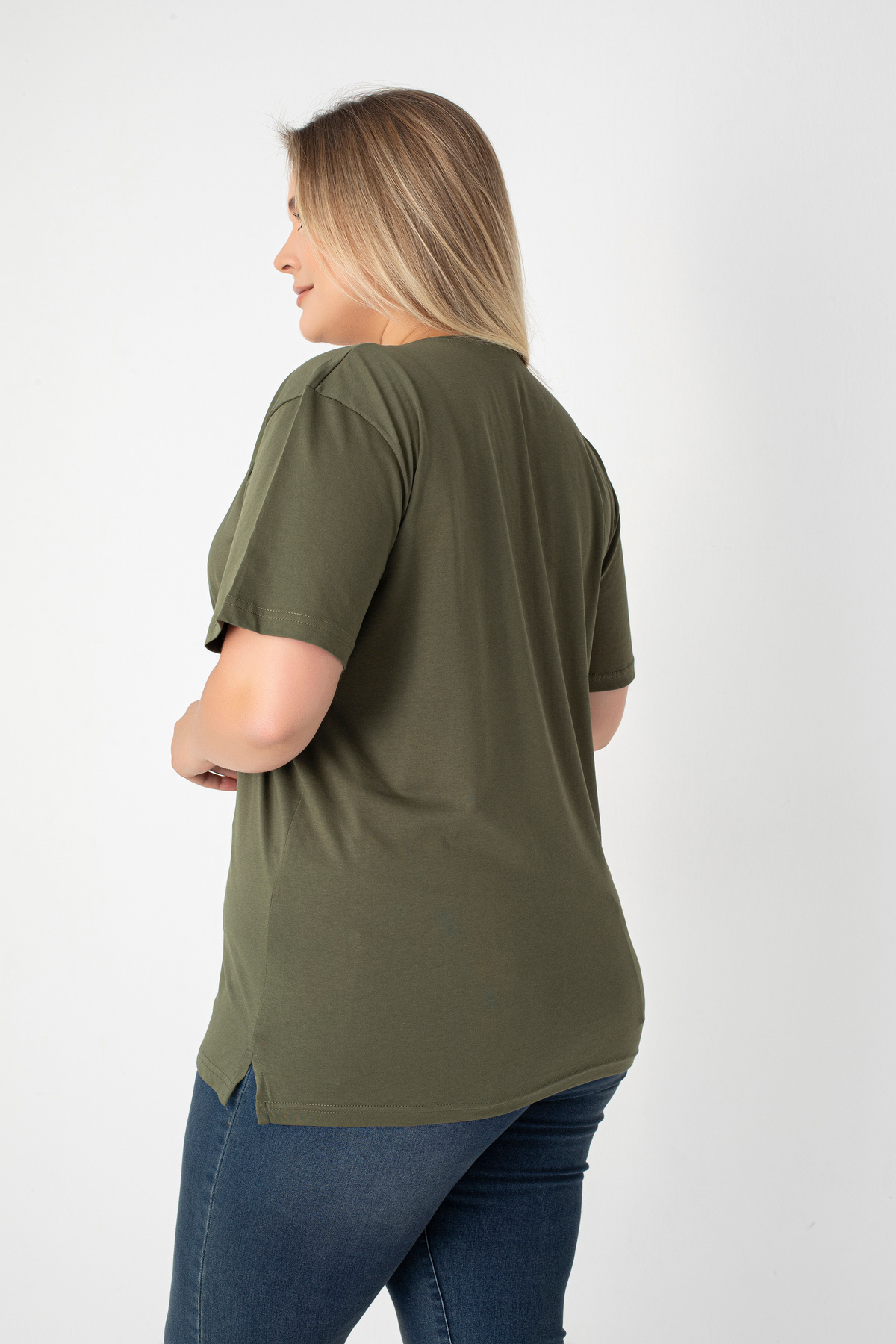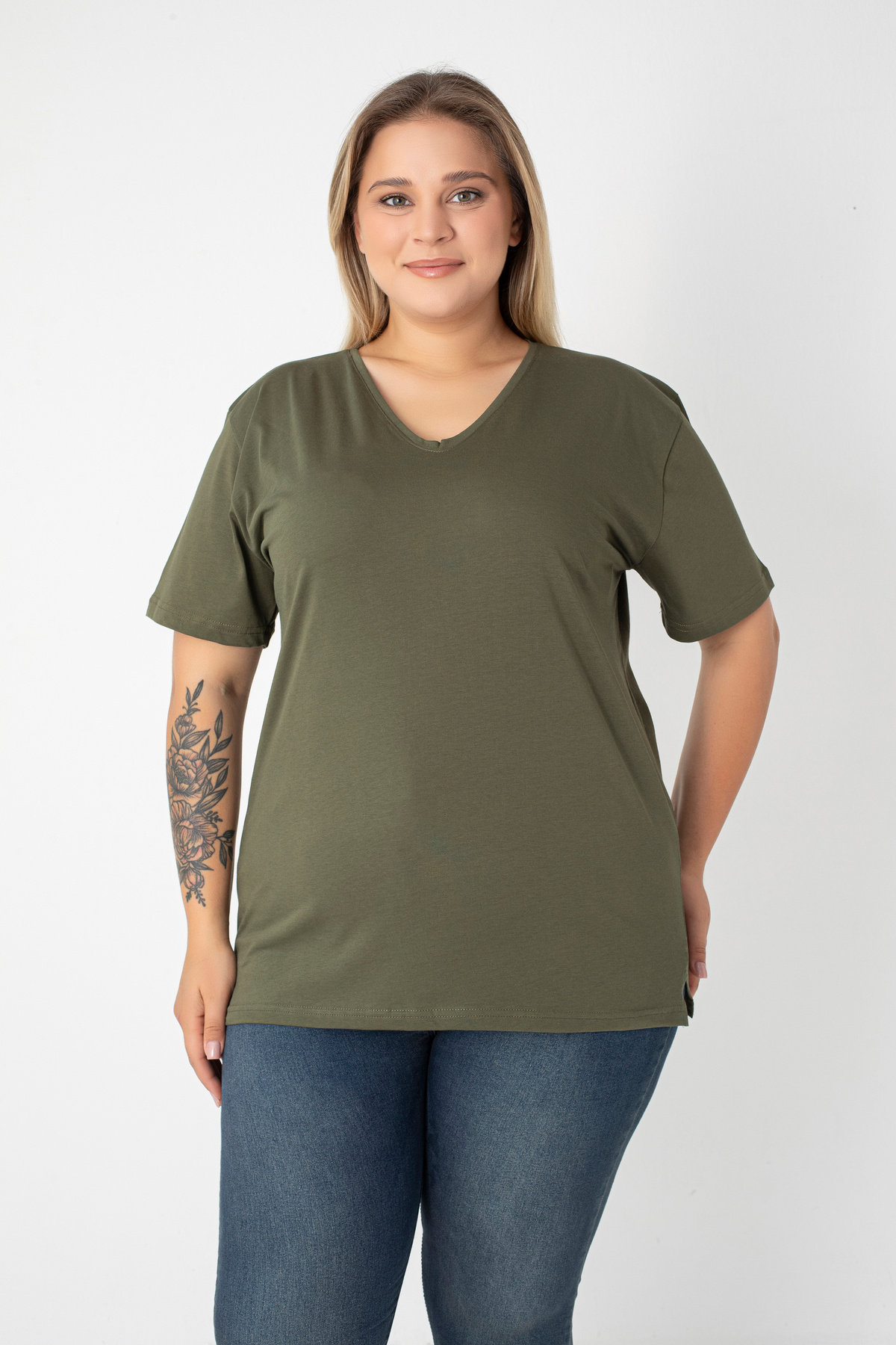 Yırtmaçlı Pamuklu Kadın V Yaka Büyük Beden T-shirt Yırtmaçlı Pamuklu Kadın V Yaka Büyük Beden T-shirt 5900 4XL