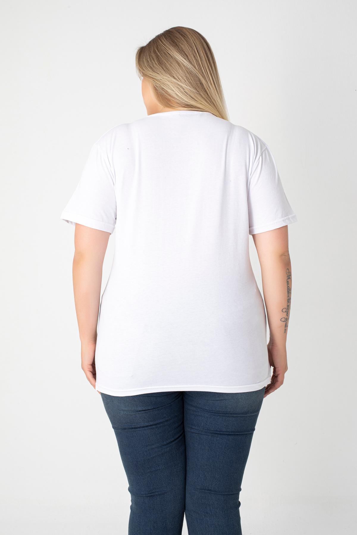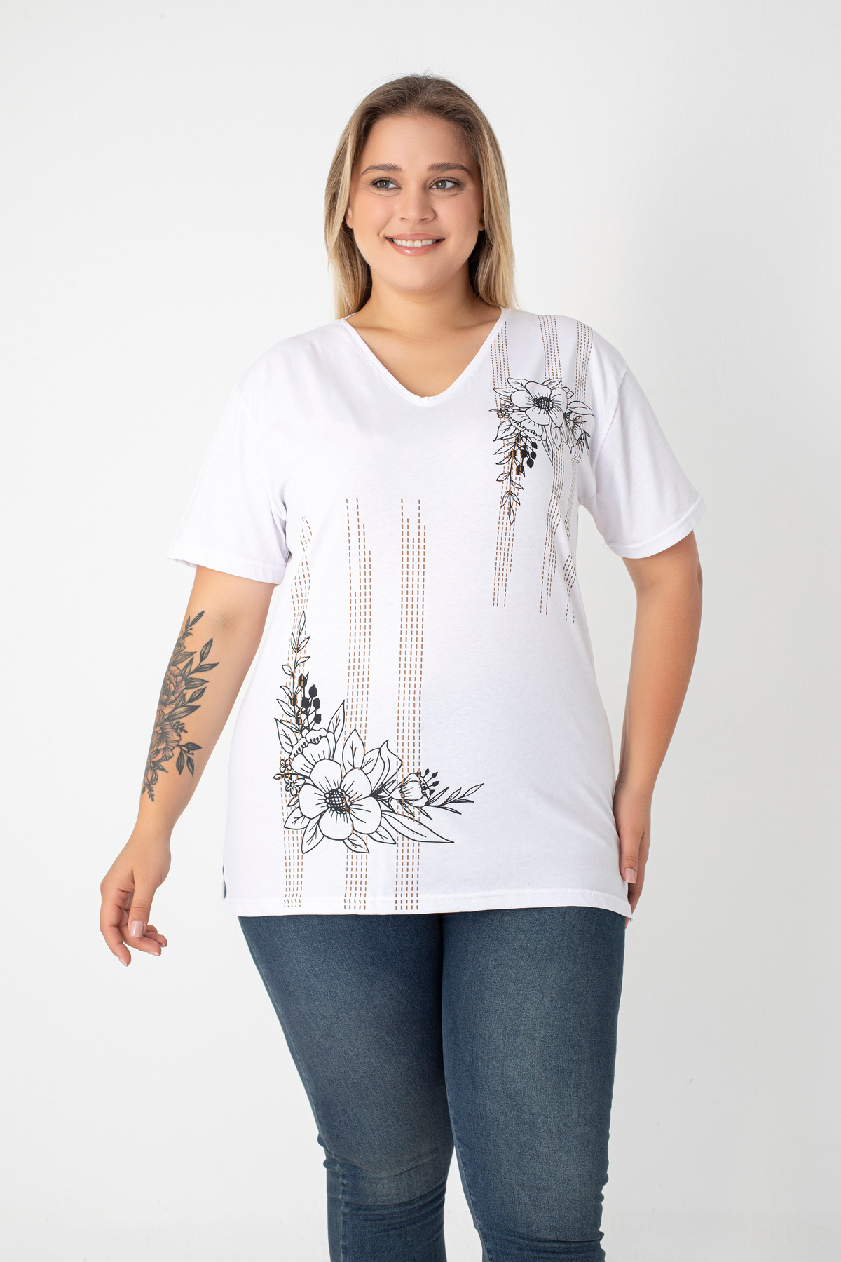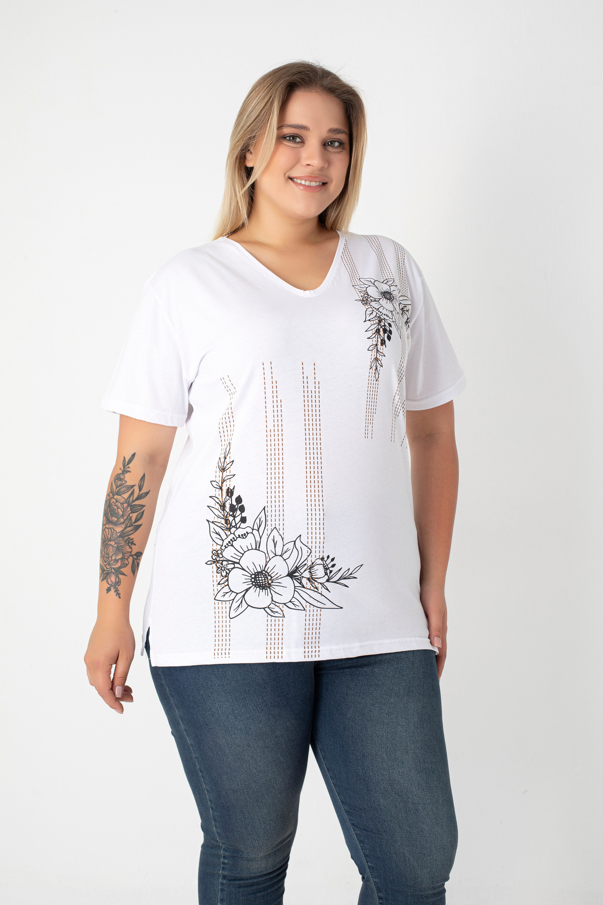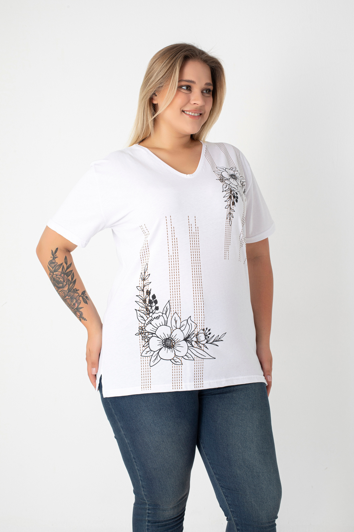 Baskılı Yırtmaçlı Pamuklu Kadın V Yaka Büyük Beden T-shirt Baskılı Yırtmaçlı Pamuklu Kadın V Yaka Büyük Beden T-shirt 5901 4XL
