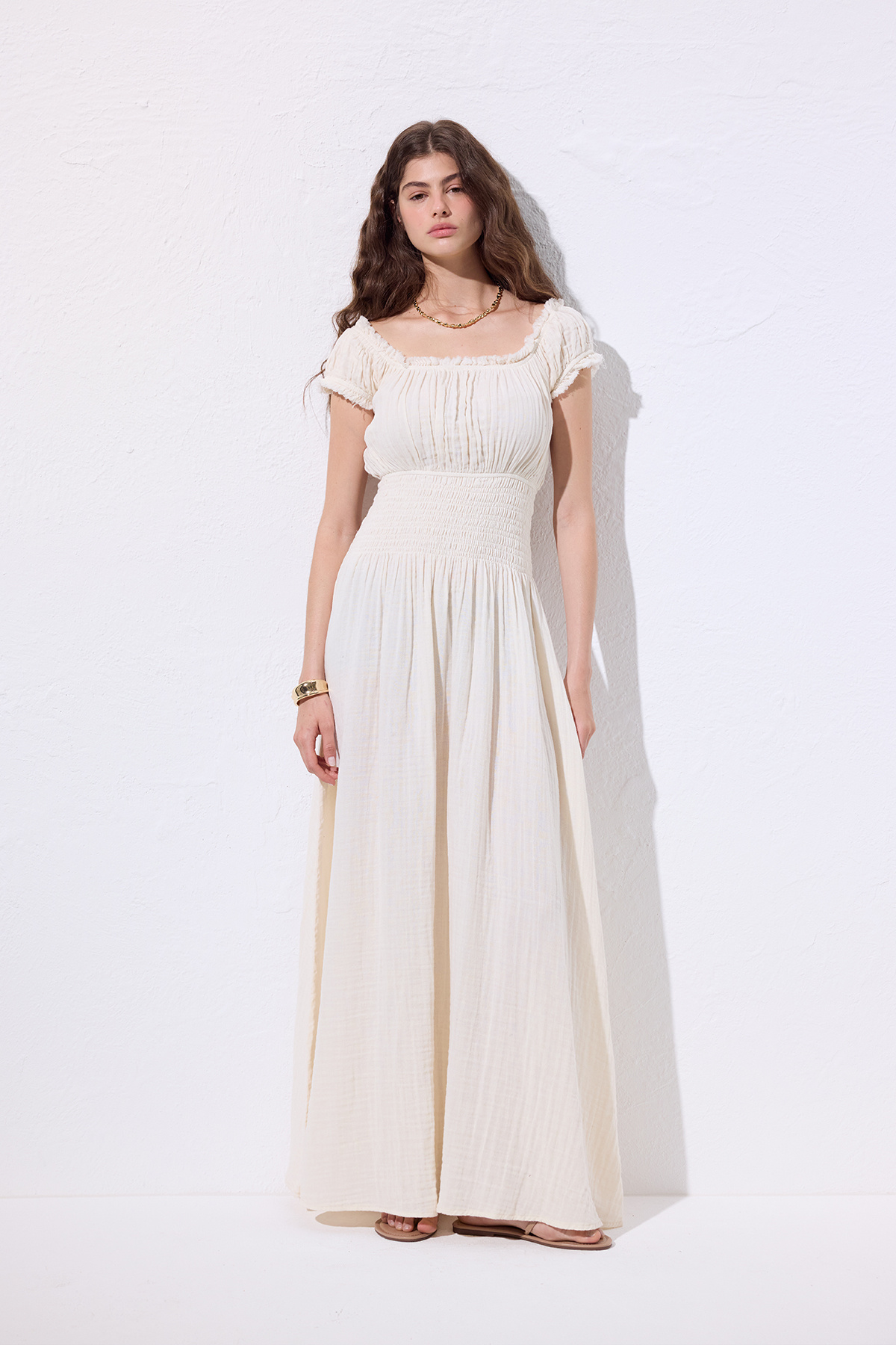 MÜSLİN BÜZGÜLÜ ELBİSE BEJ MÜSLİN BÜZGÜLÜ ELBİSE BEJ SS25ELB00056 L