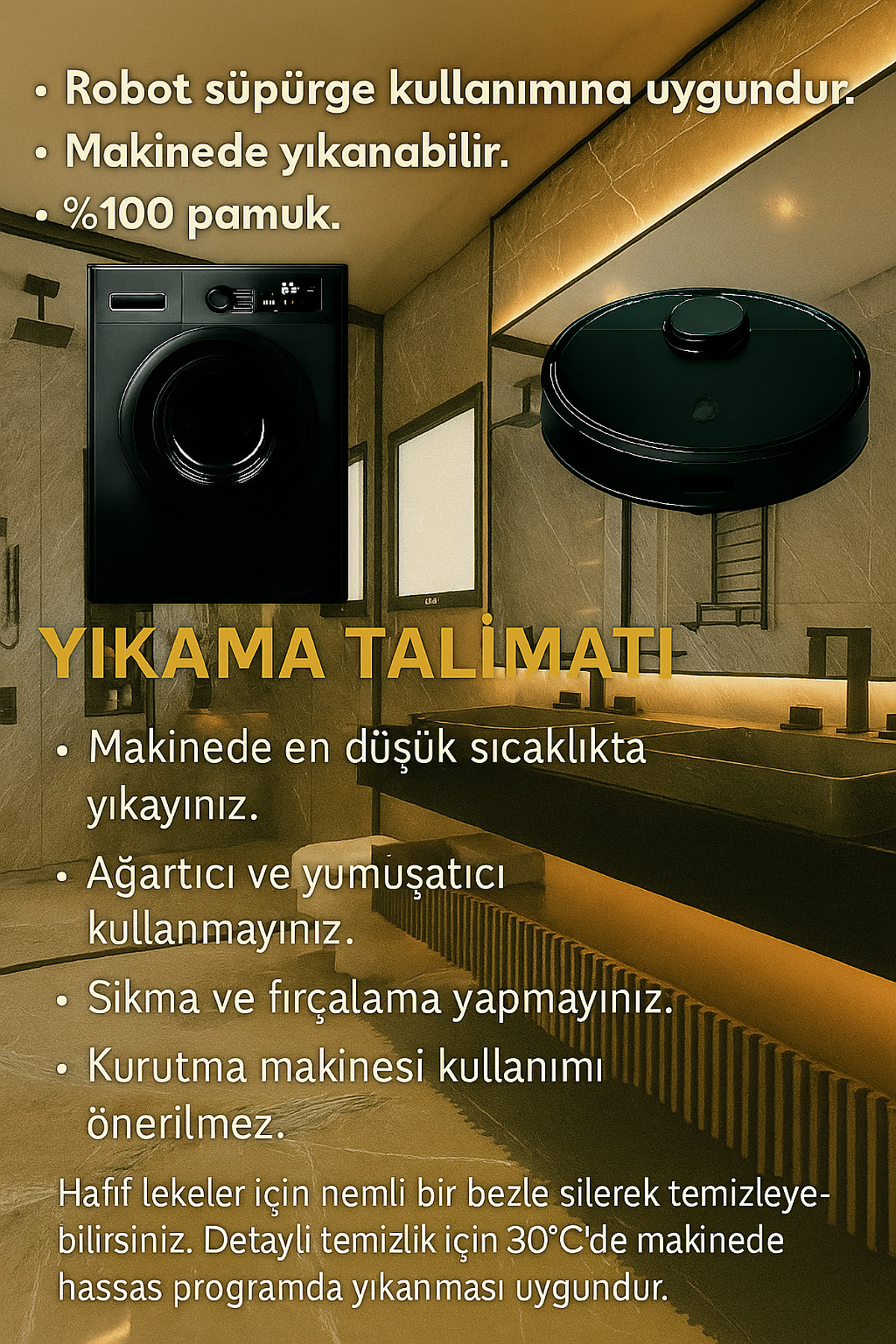 - Yıkama Talimatı : En düşük derecede , yumuşatıcı kullanmadan , sıkma yapmadan , elde yıkarken ise fırça kullanmadan yıkamanız tavsiye edilir .