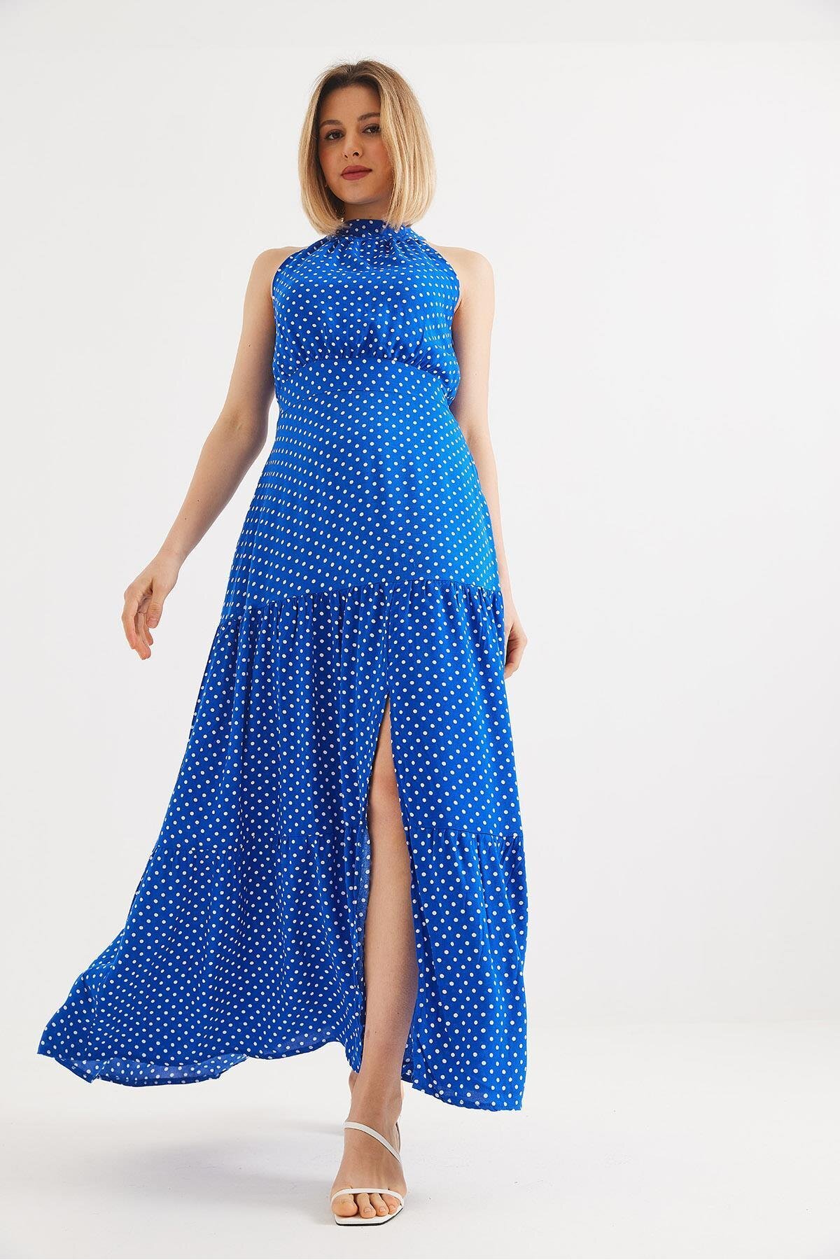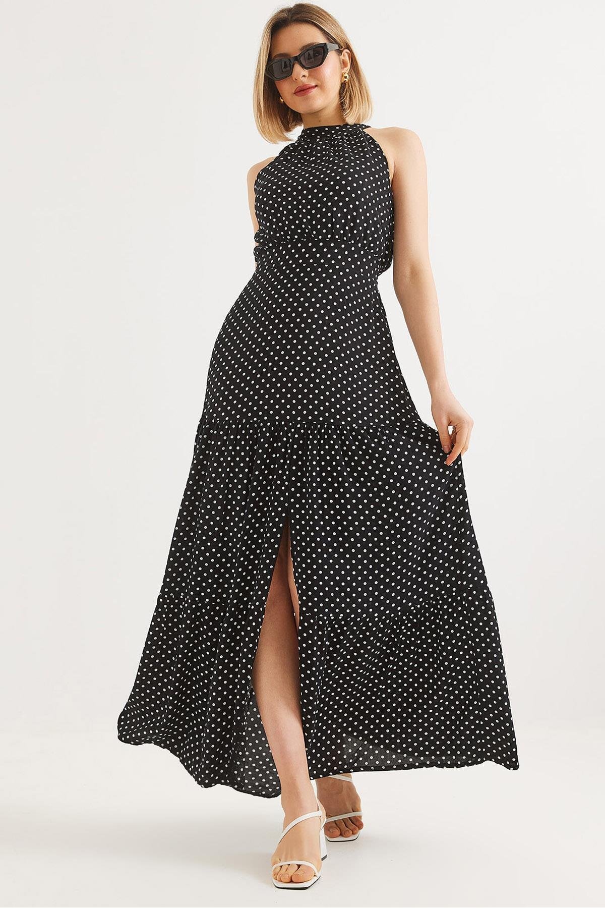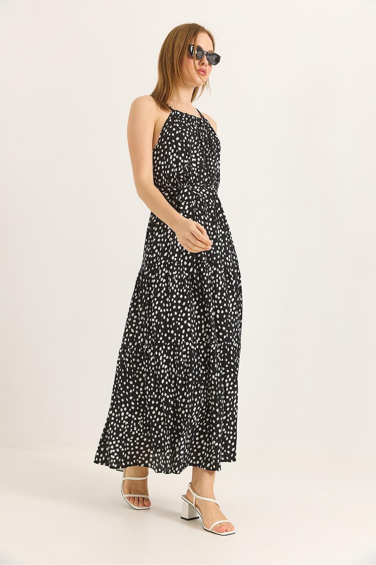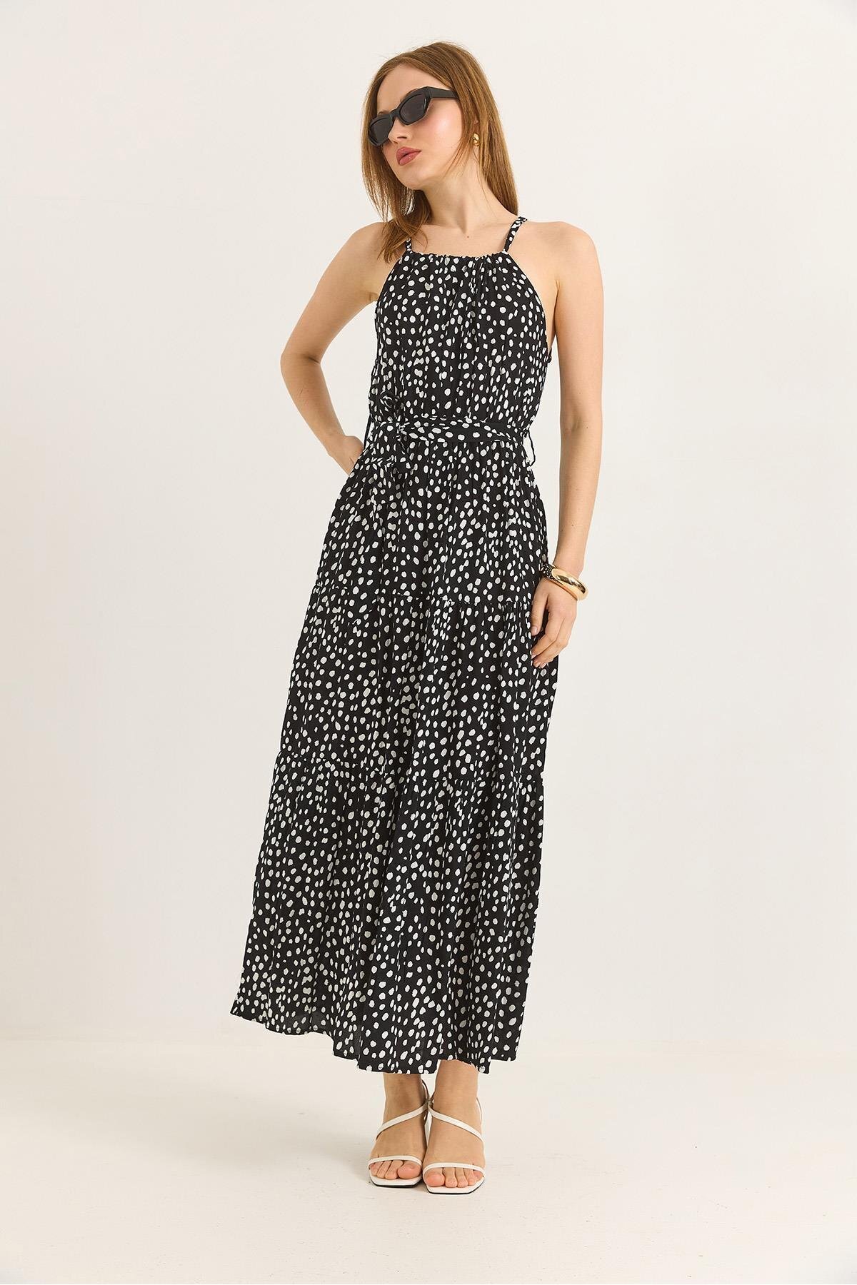 Halter Yaka Beli Kuşaklı Puantiyeli Siyah Elbise Halter Yaka Beli Kuşaklı Puantiyeli Siyah Elbise 250670ELBZSBYZ XL