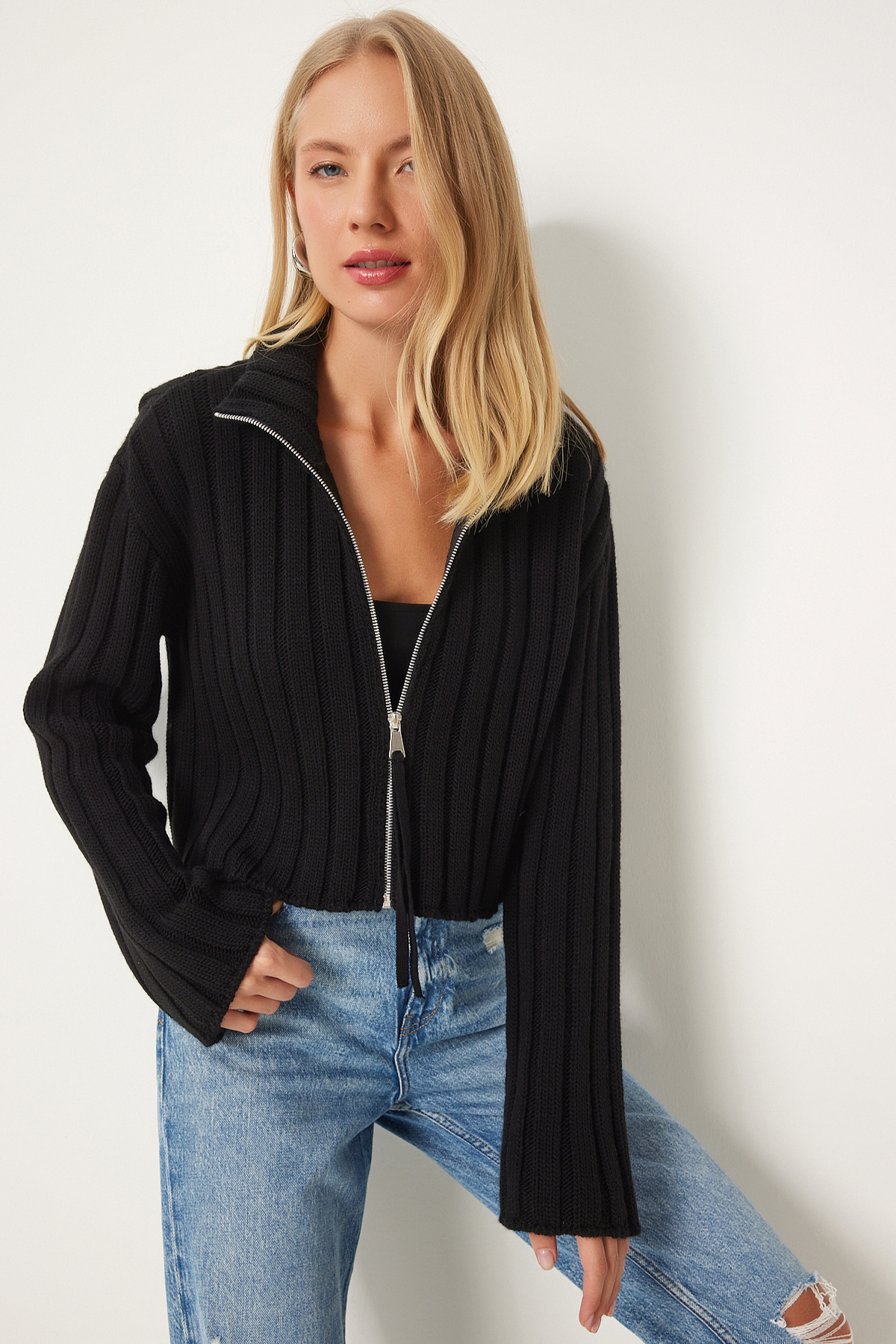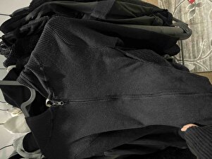 Kadın Siyah Kapüşonlu Fermuarlı Fitilli Triko Hırka UB00408 Kadın Siyah Kapüşonlu Fermuarlı Fitilli Triko Hırka UB00408 تک سایز