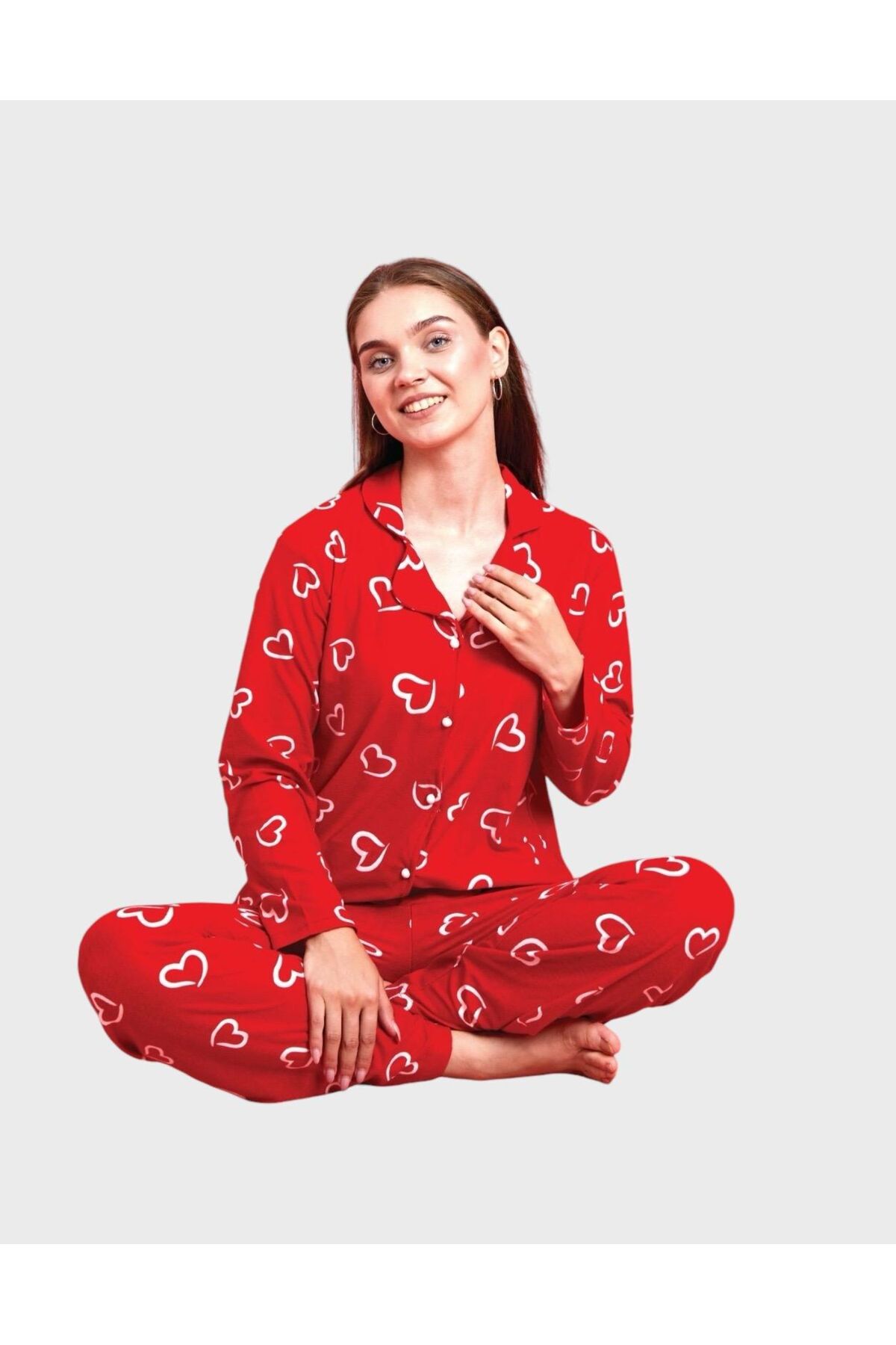 Kadın %100 Pamuklu Süet Kırmızı Kar Tanesi Desenli Biyeli Düğmeli Uzun Kollu Kışlık Pijama Takımı Kadın %100 Pamuklu Süet Kırmızı Kar Tanesi Desenli Biyeli Düğmeli Uzun Kollu Kışlık Pijama Takımı çg52046 2XL