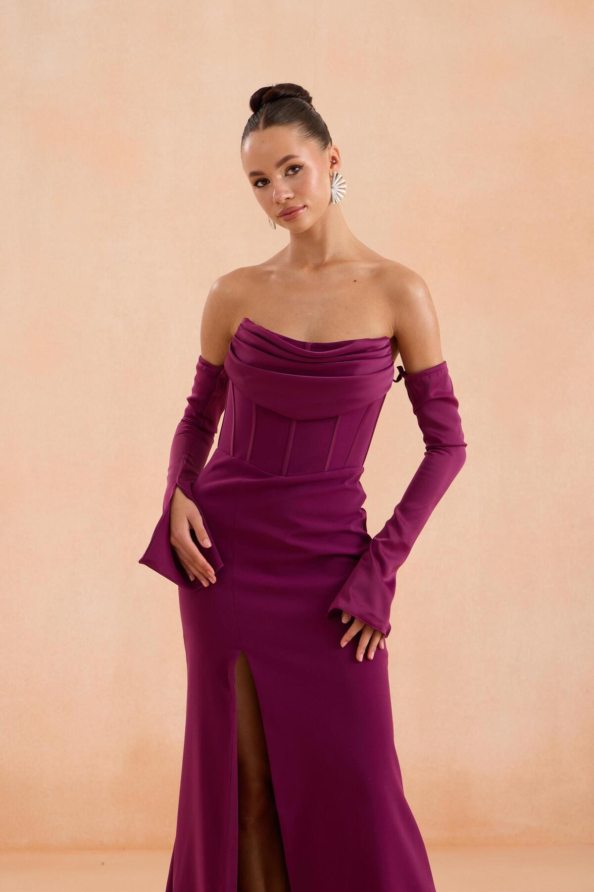 Mürdüm Eldivenli Yırtmaçlı Krep Abiye Elbise Mürdüm Eldivenli Yırtmaçlı Krep Abiye Elbise 58571 42