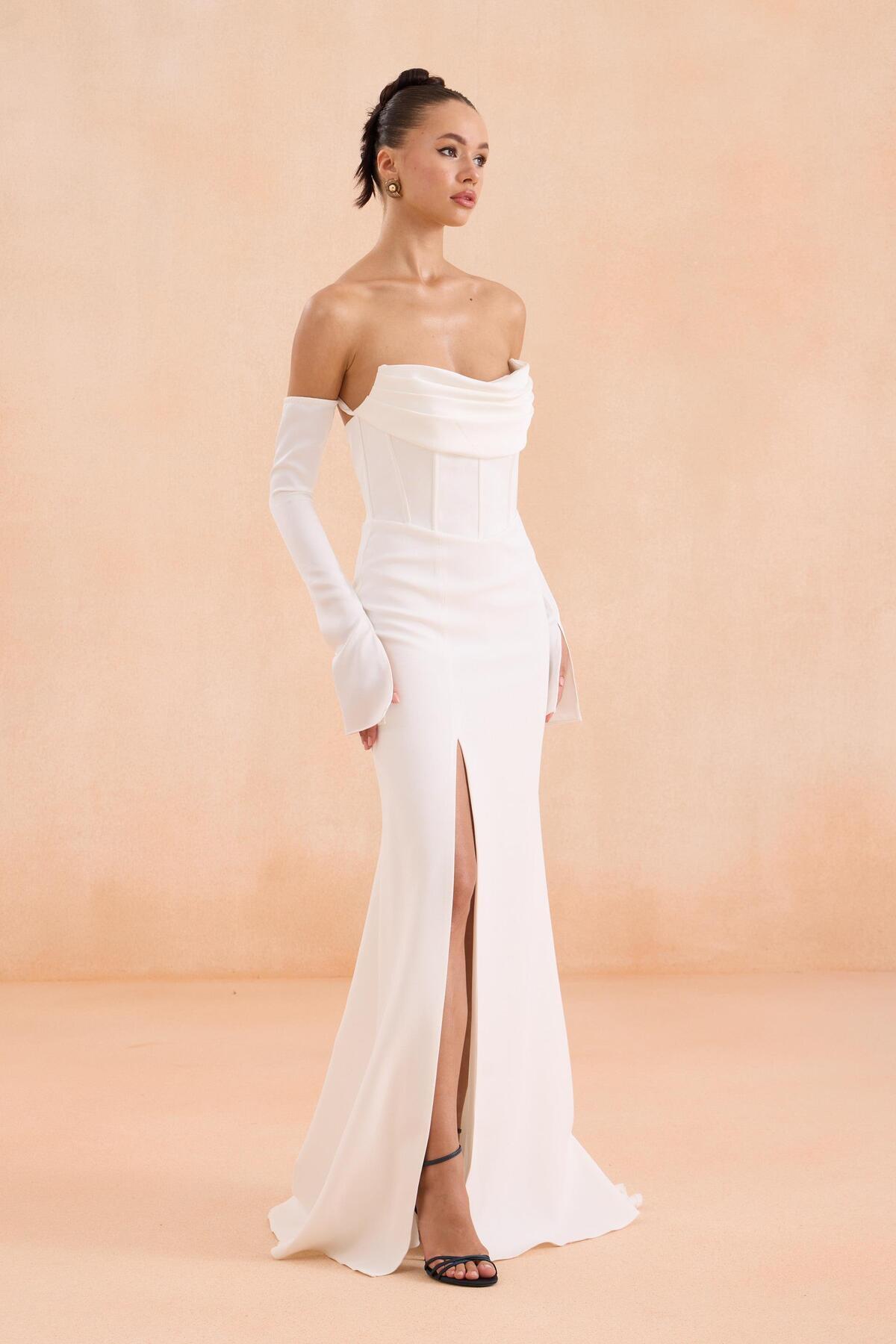 Beyaz Eldivenli Yırtmaçlı Krep Nikah Elbisesi Beyaz Eldivenli Yırtmaçlı Krep Nikah Elbisesi 58571 42