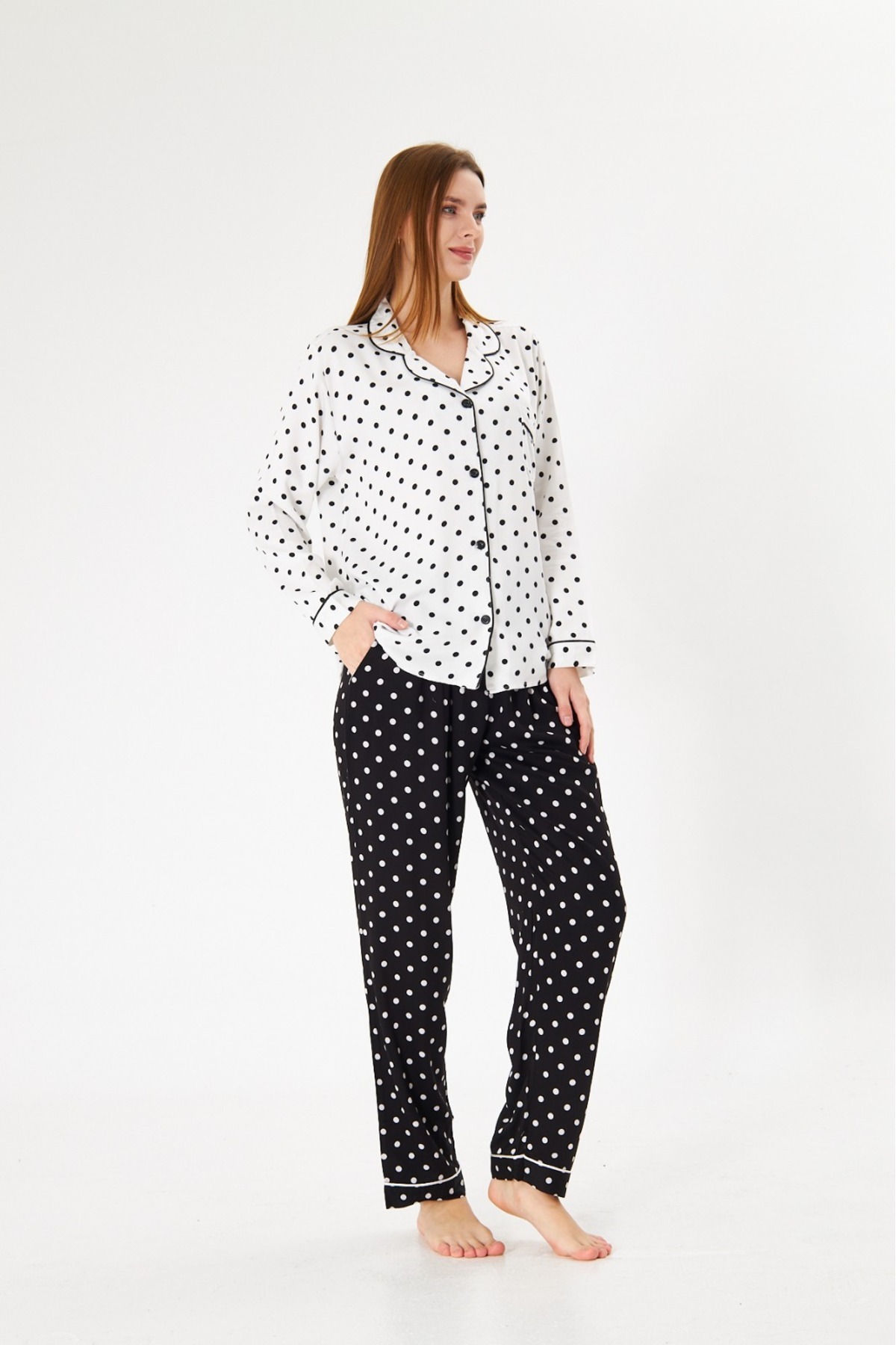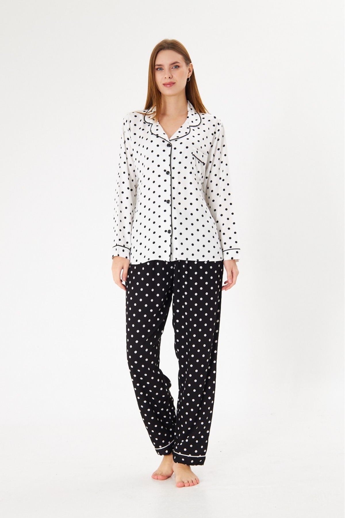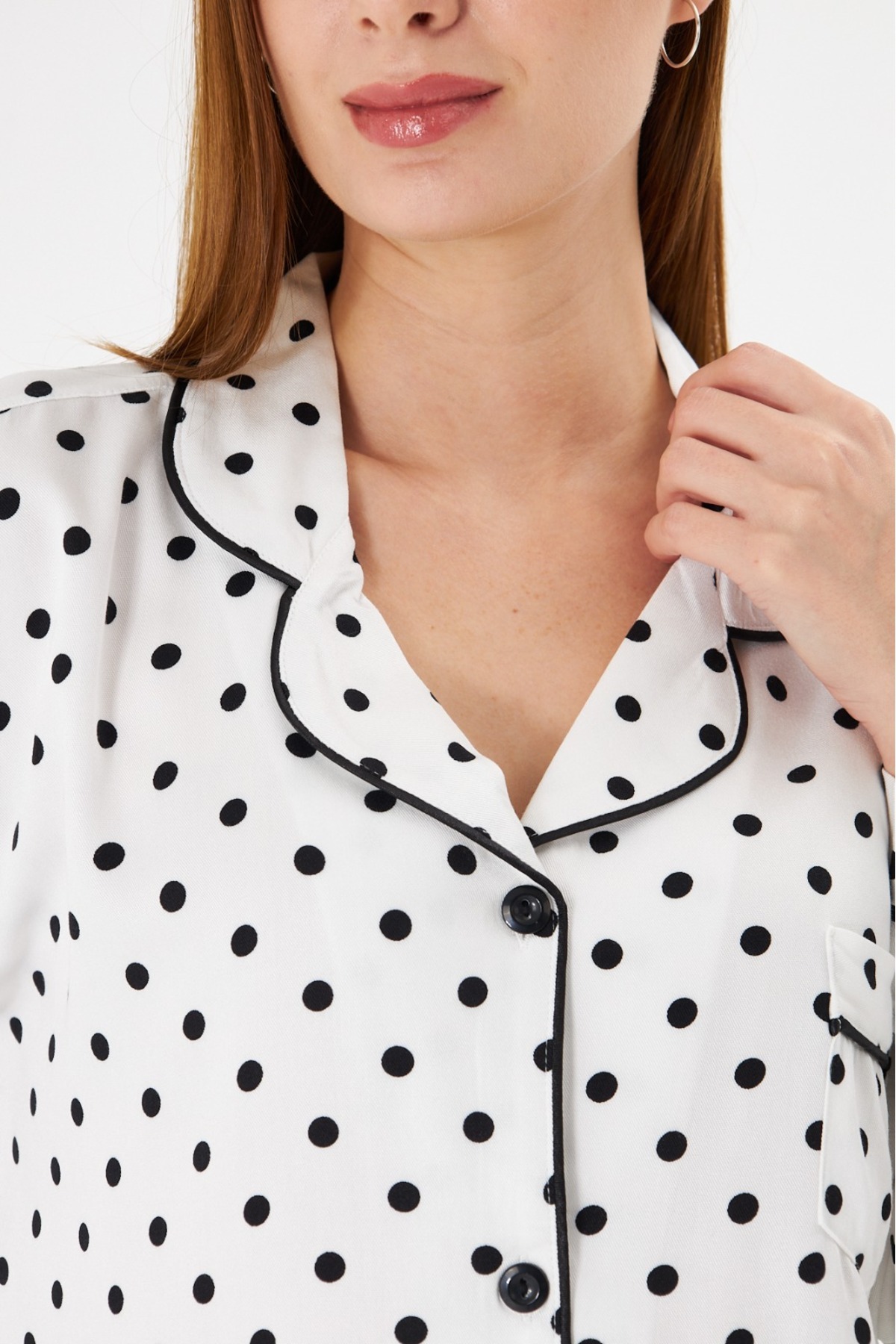 Kadın %100 Pamuk Dokuma Kumaş Beyaz Puantiye Desenli Gömlek Yaka Boydan Düğmeli Cepli Pijama Takımı Kadın %100 Pamuk Dokuma Kumaş Beyaz Puantiye Desenli Gömlek Yaka Boydan Düğmeli Cepli Pijama Takımı sl14608 2XL