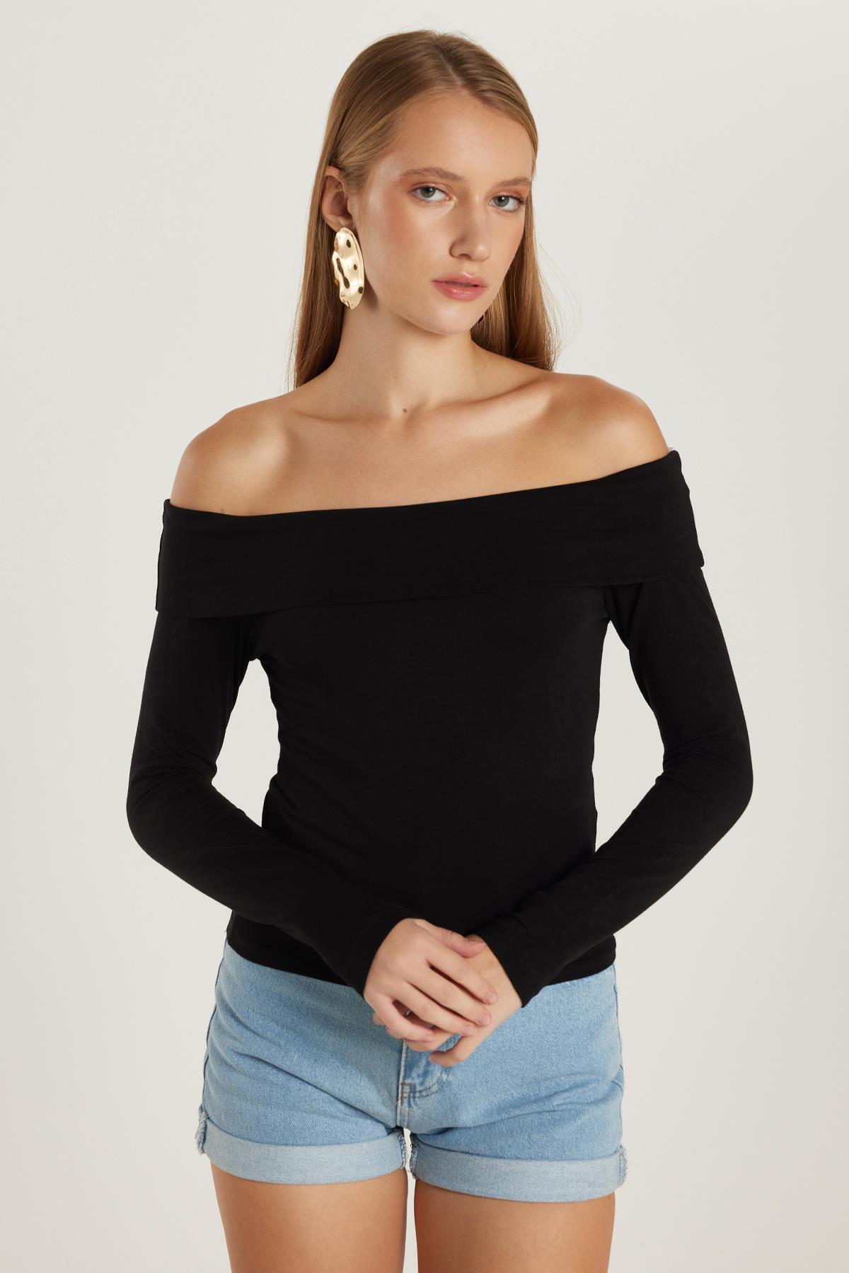 Kadın Slim Fit Dar Kesim Uzun Kol Kayık Yaka Siyah Bluz Kadın Slim Fit Dar Kesim Uzun Kol Kayık Yaka Siyah Bluz BYGM2503 L