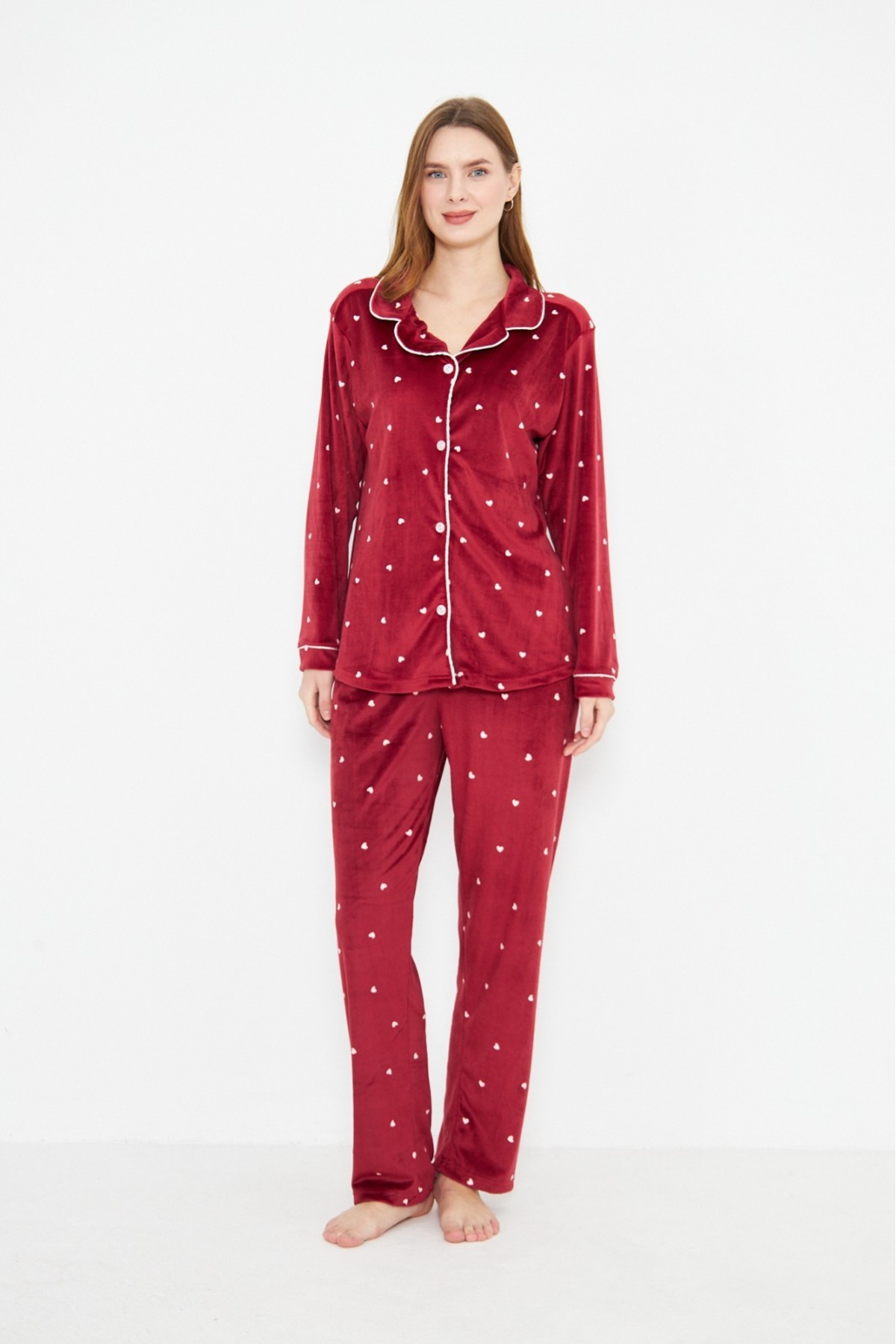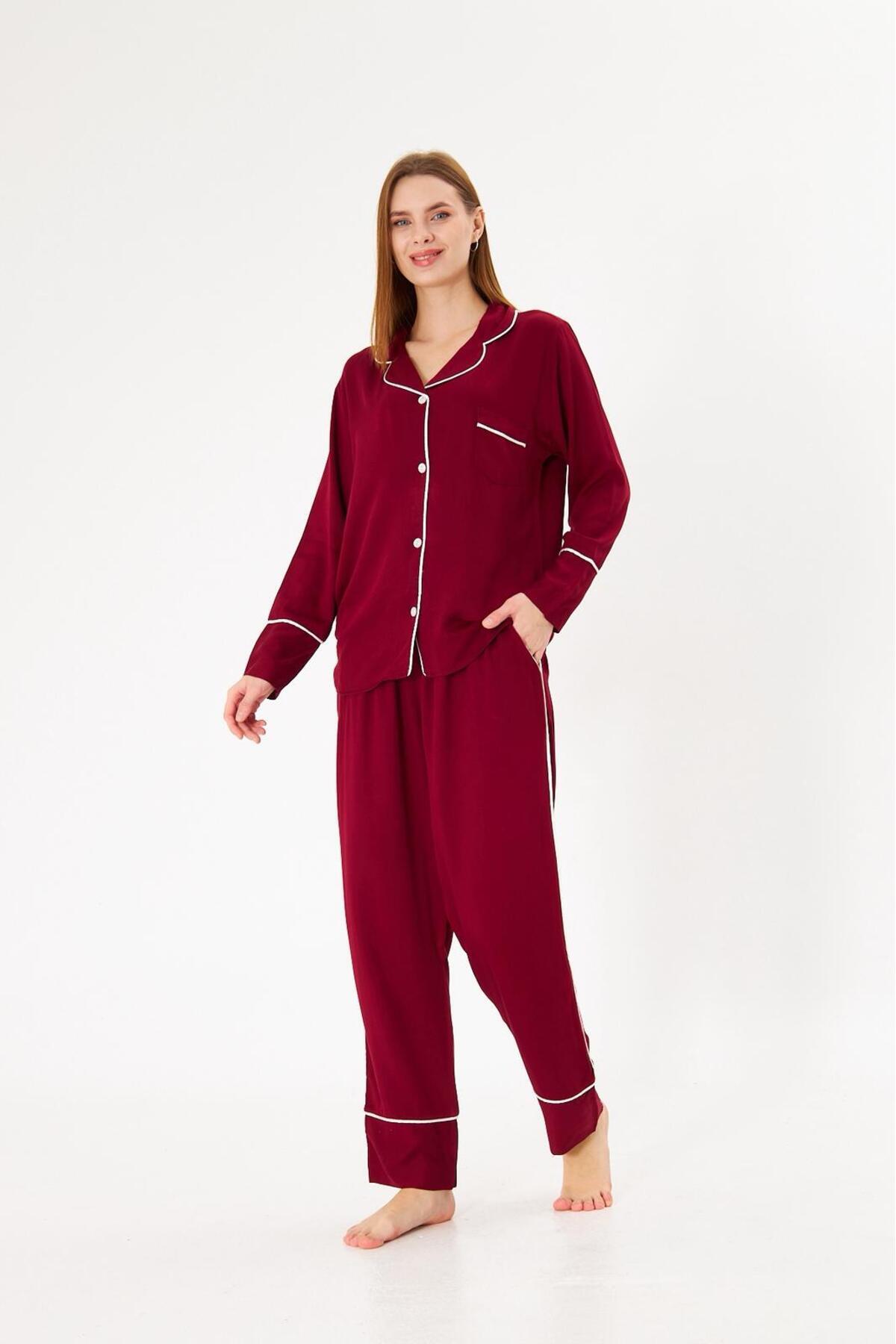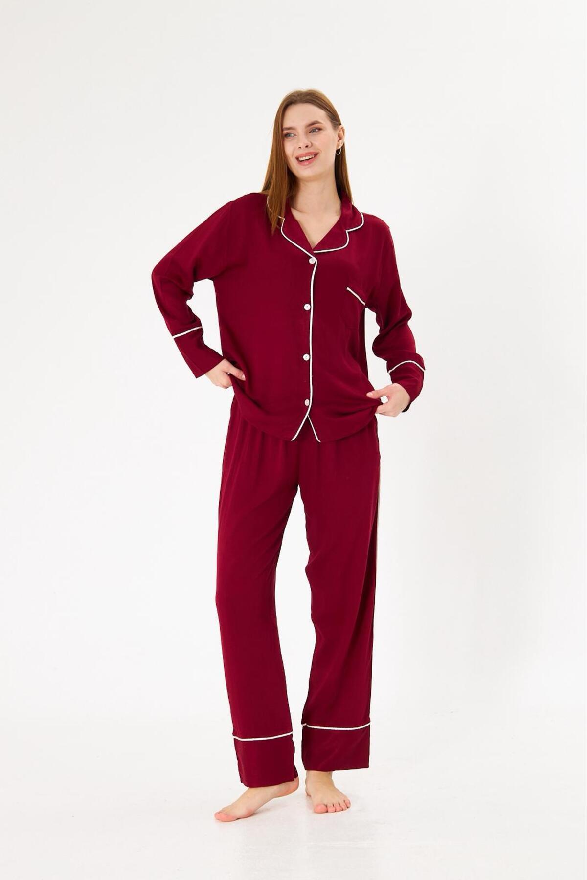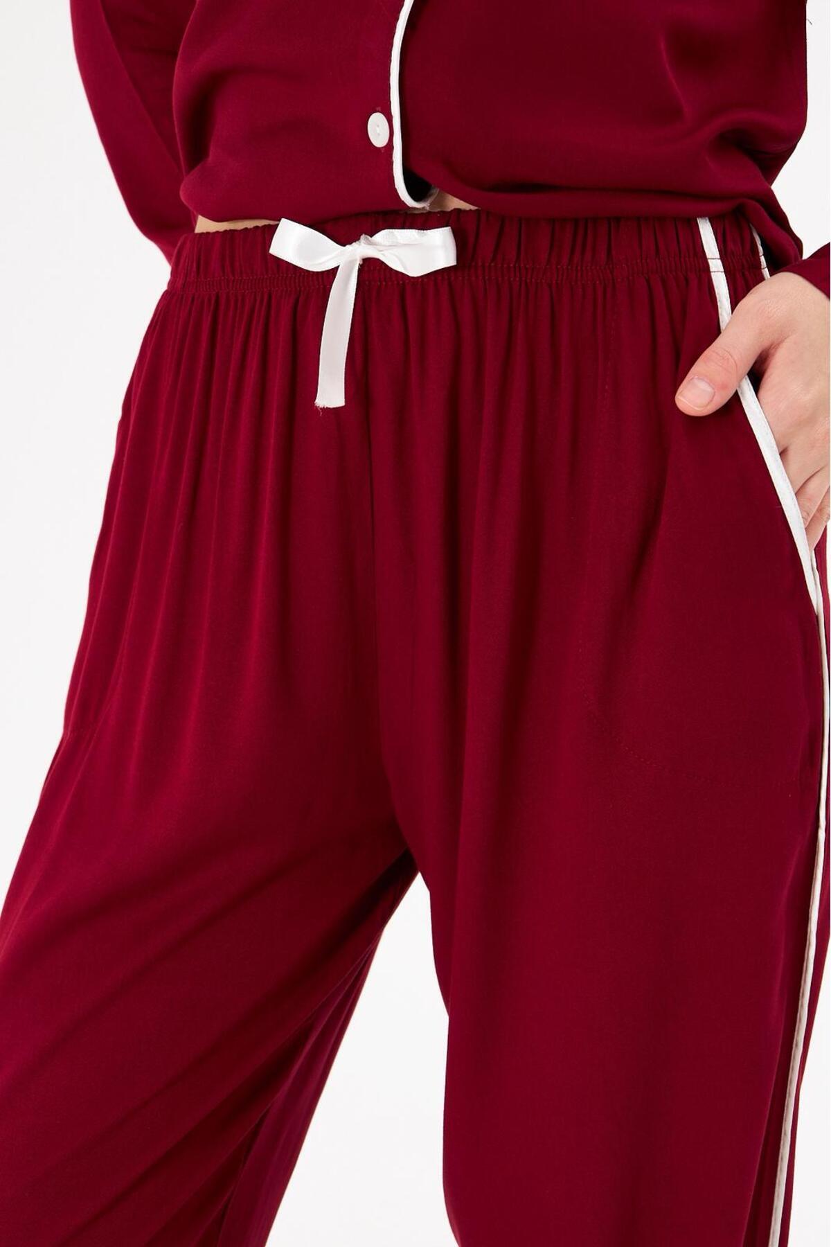 Kadın %100 Pamuk Dokuma Kumaş Bordo Renk Beyaz Biye Gömlek Yaka Boydan Düğmeli Cepli Pijama Takımı Kadın %100 Pamuk Dokuma Kumaş Bordo Renk Beyaz Biye Gömlek Yaka Boydan Düğmeli Cepli Pijama Takımı sl5003 2XL