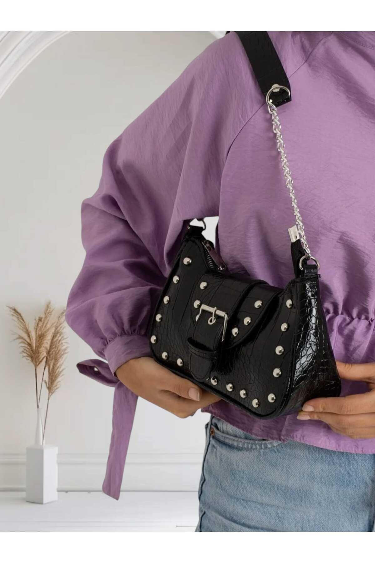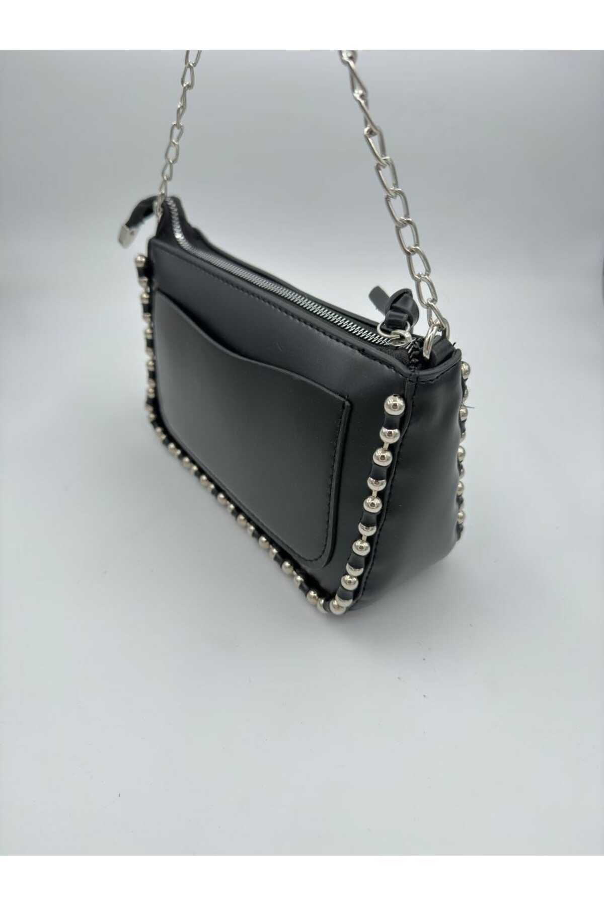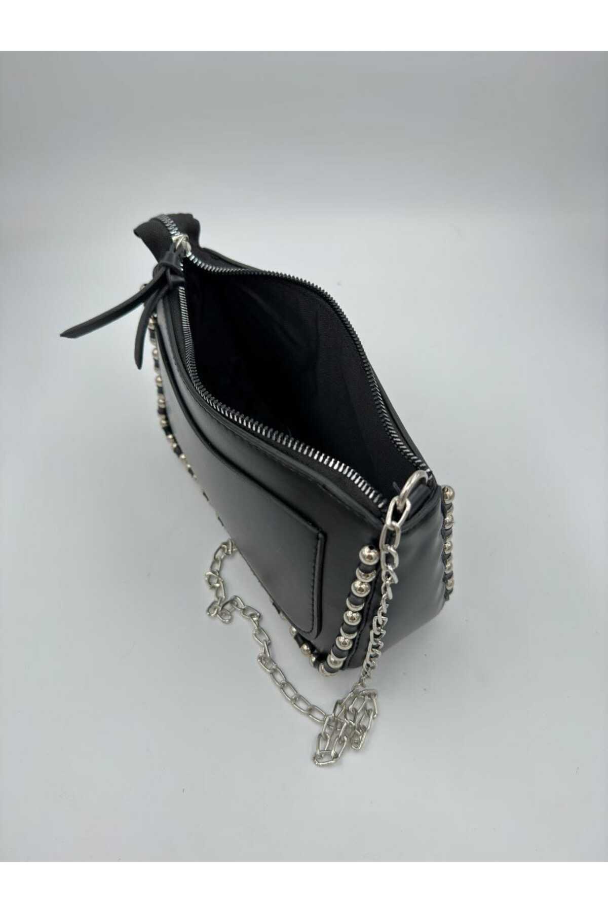Kadın Siyah Zımbalı Çapraz Zincir Askılı Cüzdan Çanta Kadın Siyah Zımbalı Çapraz Zincir Askılı Cüzdan Çanta MKA1018 تک سایز
