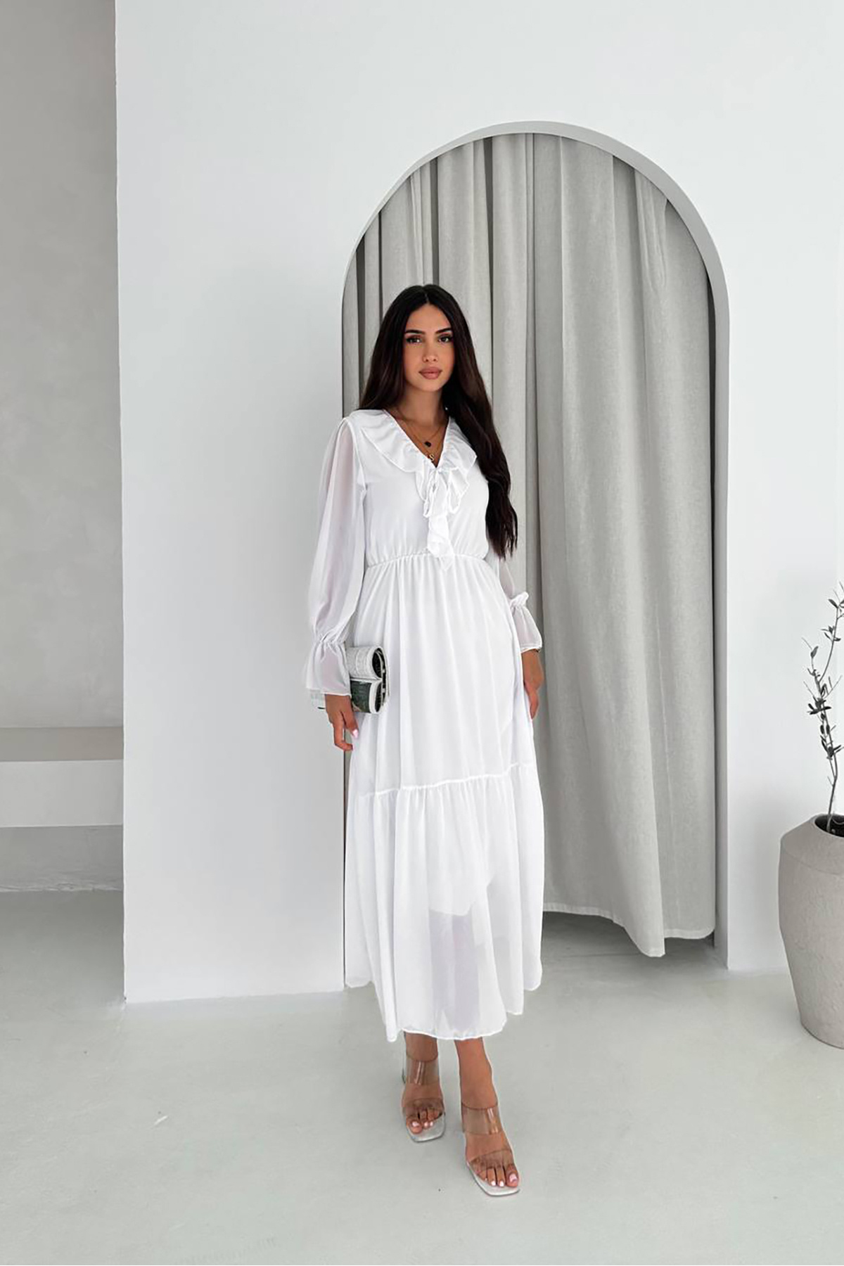 kadın beyaz volanlı astarlı şifon elbise NBK4241 kadın beyaz volanlı astarlı şifon elbise NBK4241 42