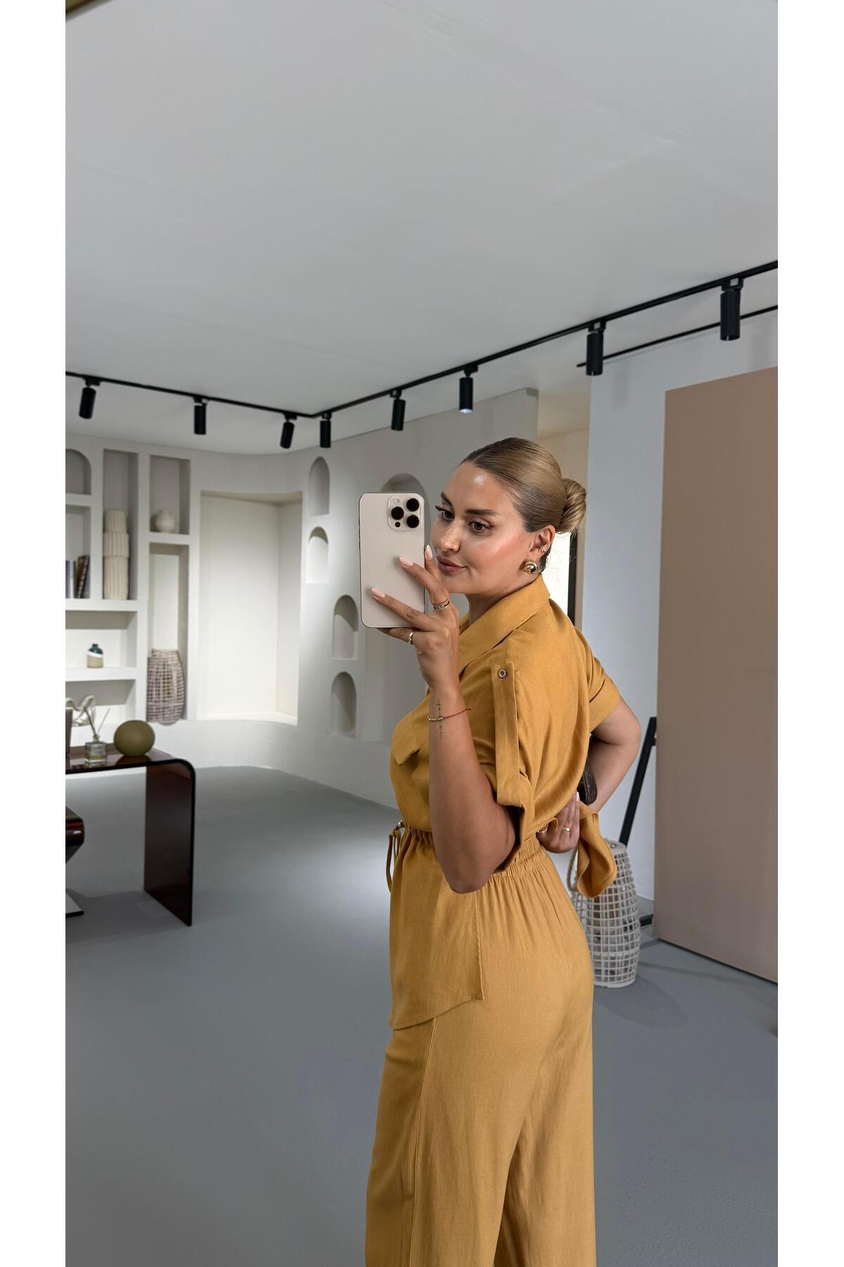 Apoletli Bel Büzgü Detay Hardal Keten Takım Apoletli Bel Büzgü Detay Hardal Keten Takım TKM-0149-HRD L