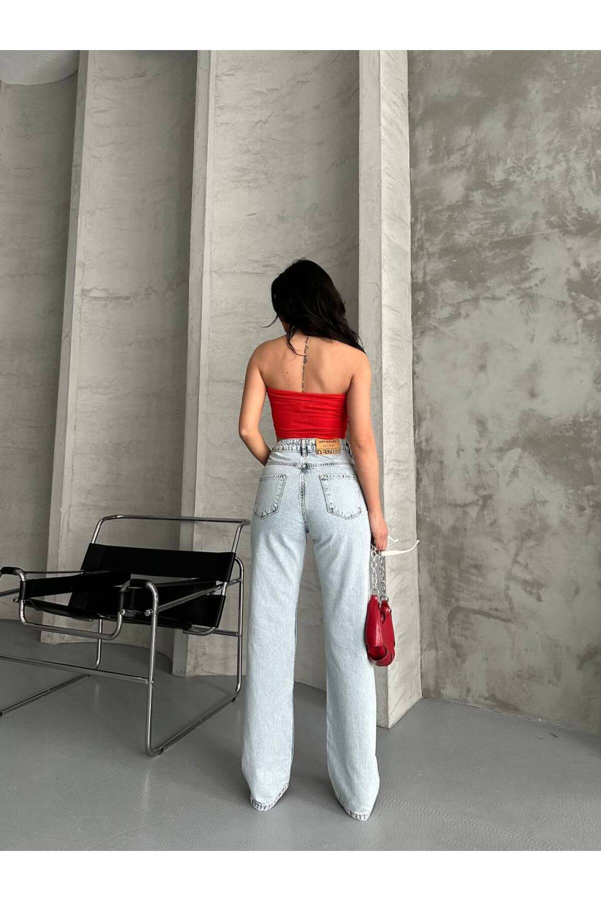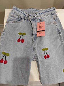 Kadın Yüksek Bel Kiraz Nakışlı Mom Jean Pantolon Kadın Yüksek Bel Kiraz Nakışlı Mom Jean Pantolon MTXMM1 42