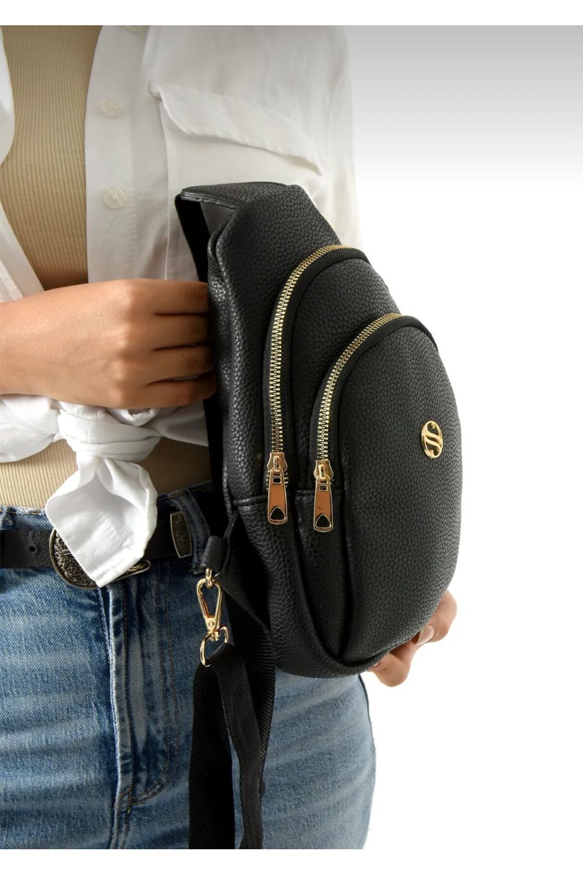Kadın Siyah Çapraz Askılı Gold Aksesuar Kulaklık Çıkışlı Bel ve Göğüs Çantası Bodybag Kadın Siyah Çapraz Askılı Gold Aksesuar Kulaklık Çıkışlı Bel ve Göğüs Çantası Bodybag 5062 Standart