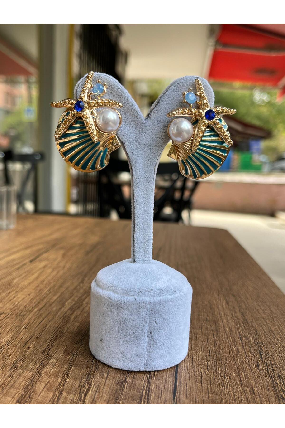 Çelik Kararmaz Deniz Yıldızı Küpe | Tarz Özel Model | İstiridye ve İnci Detaylı | Gold Renk Çelik Kararmaz Deniz Yıldızı Küpe | Tarz Özel Model | İstiridye ve İnci Detaylı | Gold Renk scan تک سایز