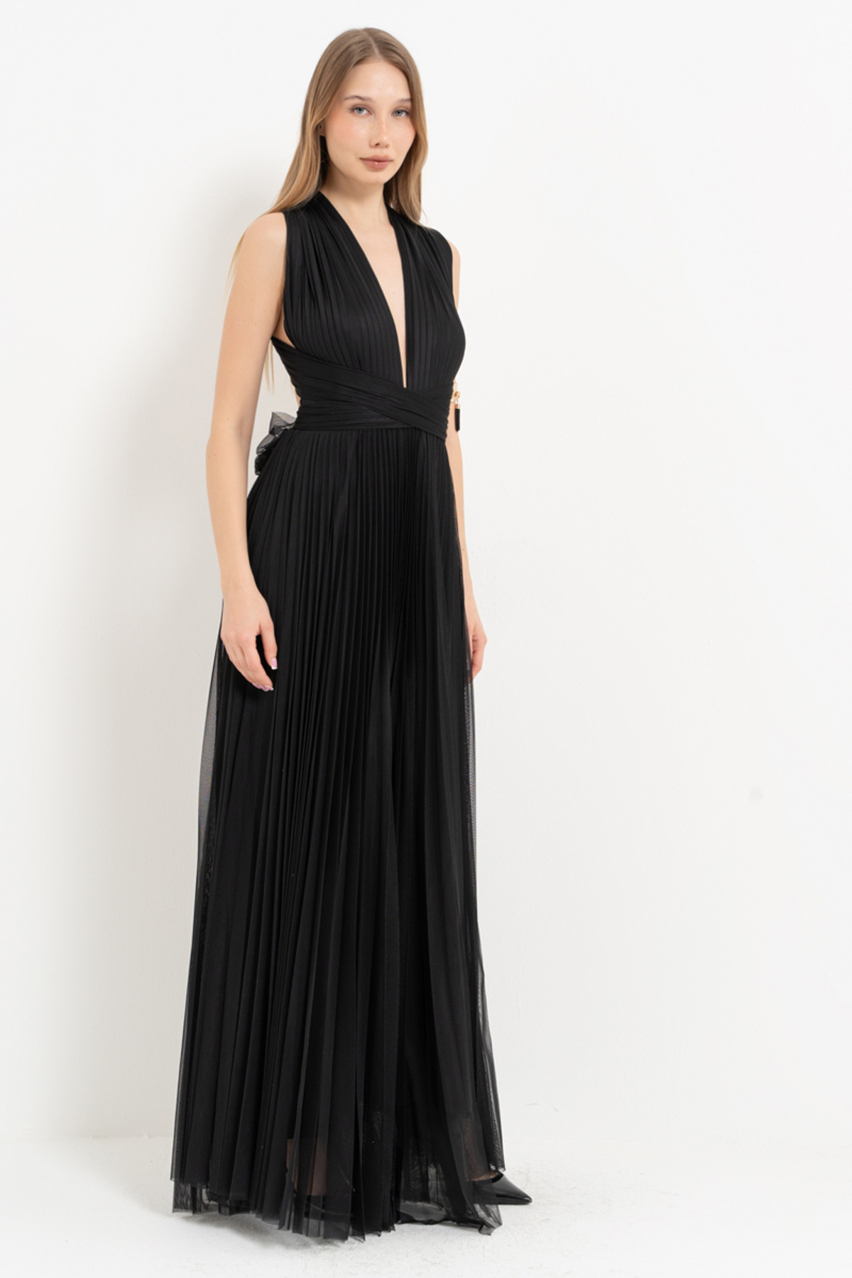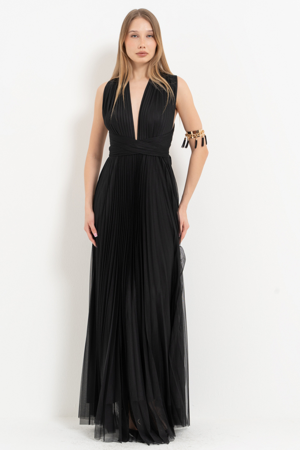 Siyah Roba Bağlamalı Pliseli Uzun Elbise Siyah Roba Bağlamalı Pliseli Uzun Elbise 59552 M