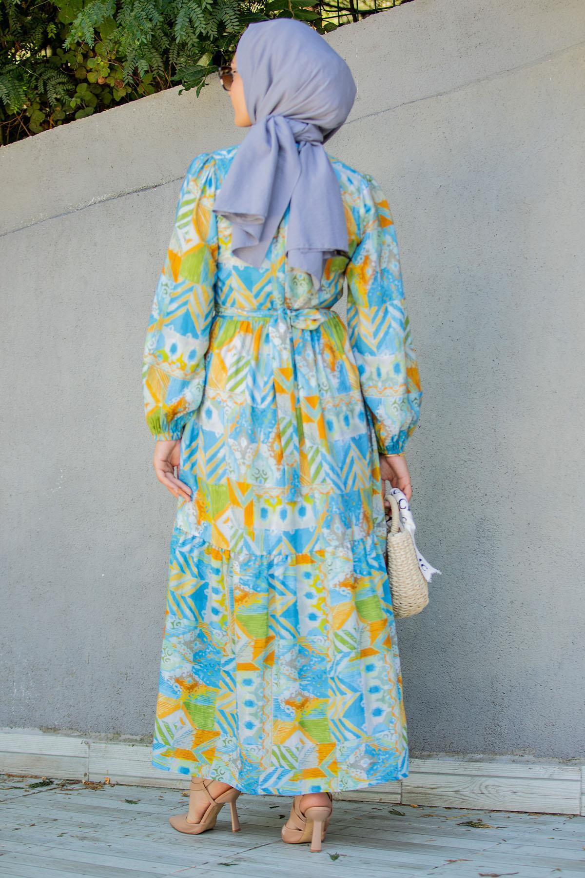 Mihre Etnik Desen Modal Krep Elbise-Mavi Mihre Etnik Desen Modal Krep Elbise-Mavi Tesettür01260 46
