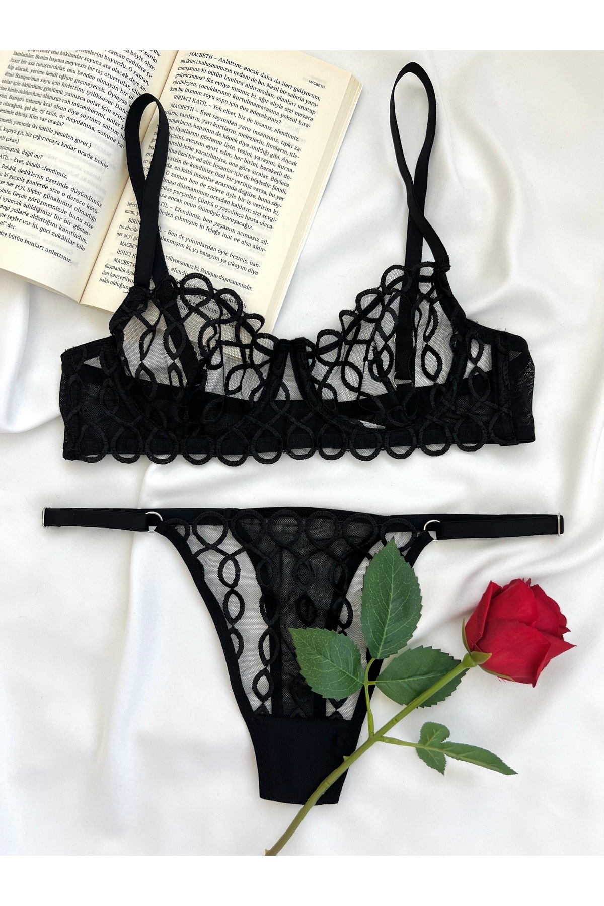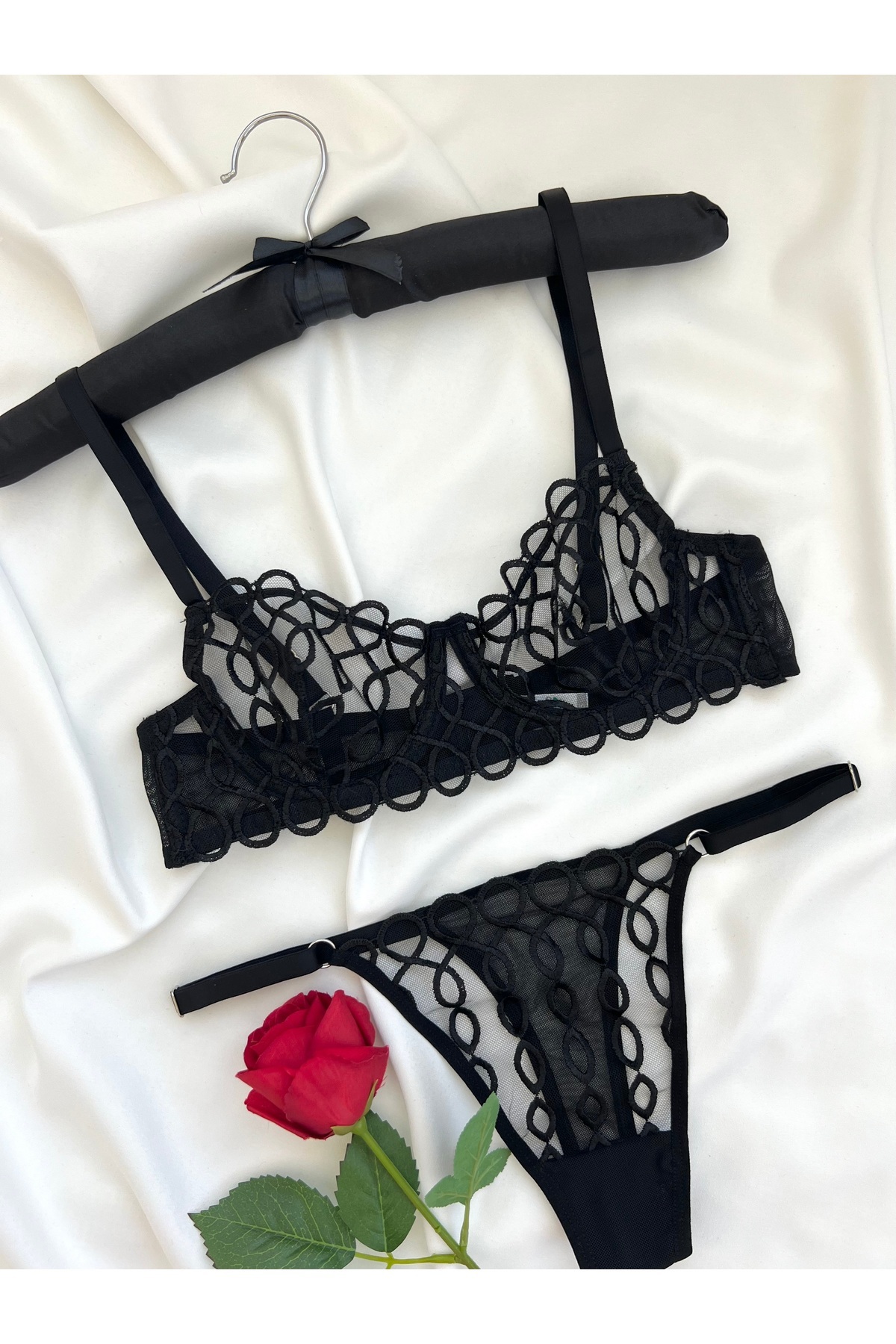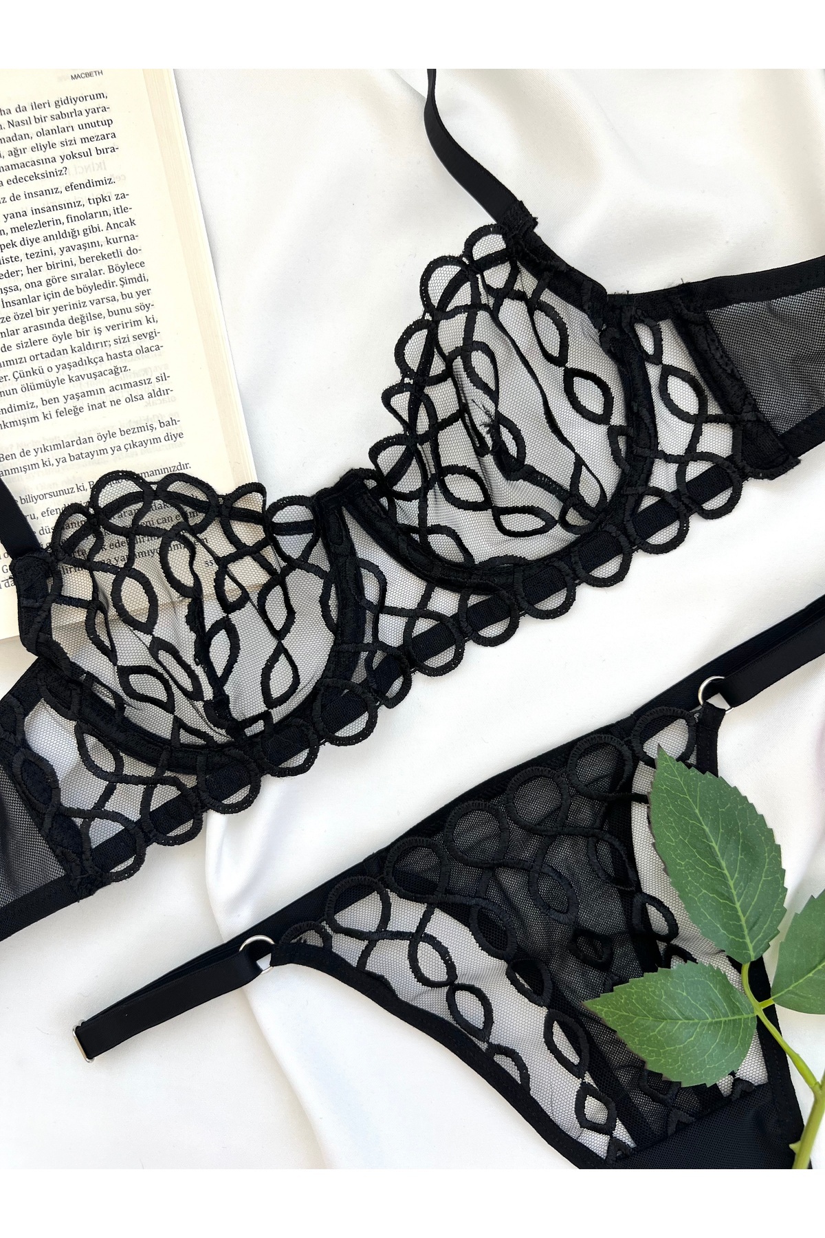 Siyah Zincir Desenli Brode Kapsız Balenli İç Çamaşırı Takımı Siyah Zincir Desenli Brode Kapsız Balenli İç Çamaşırı Takımı zincirdesen 90B