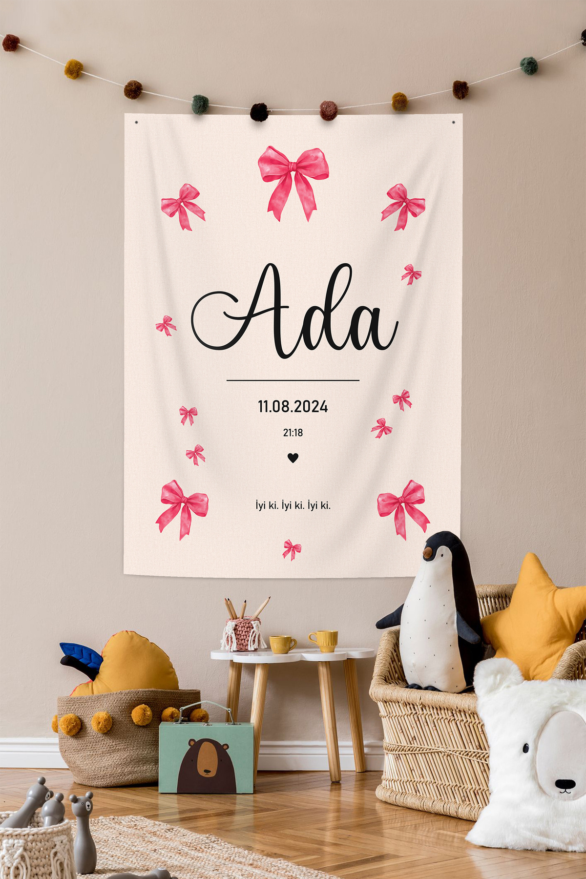 Fuşya Kurdela Fiyonk Temalı Kişiye Özel Büyük Ebat Kumaş Doğum Günü Duvar Örtüsü Panosu Flaması Fuşya Kurdela Fiyonk Temalı Kişiye Özel Büyük Ebat Kumaş Doğum Günü Duvar Örtüsü Panosu Flaması DOG42 270 x 150