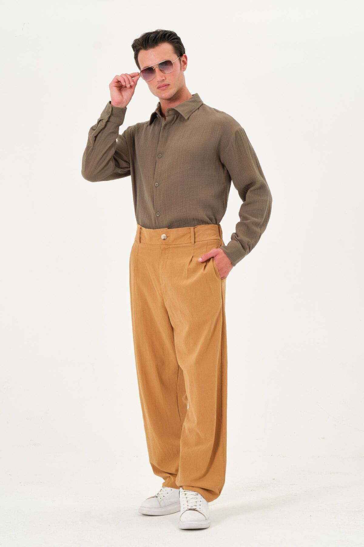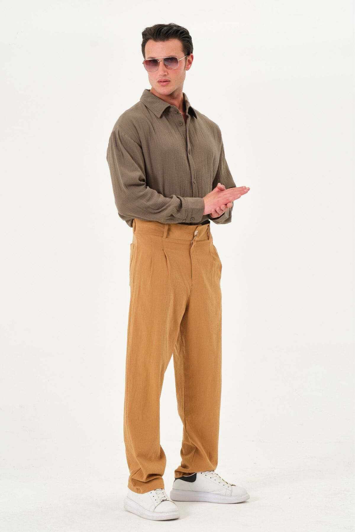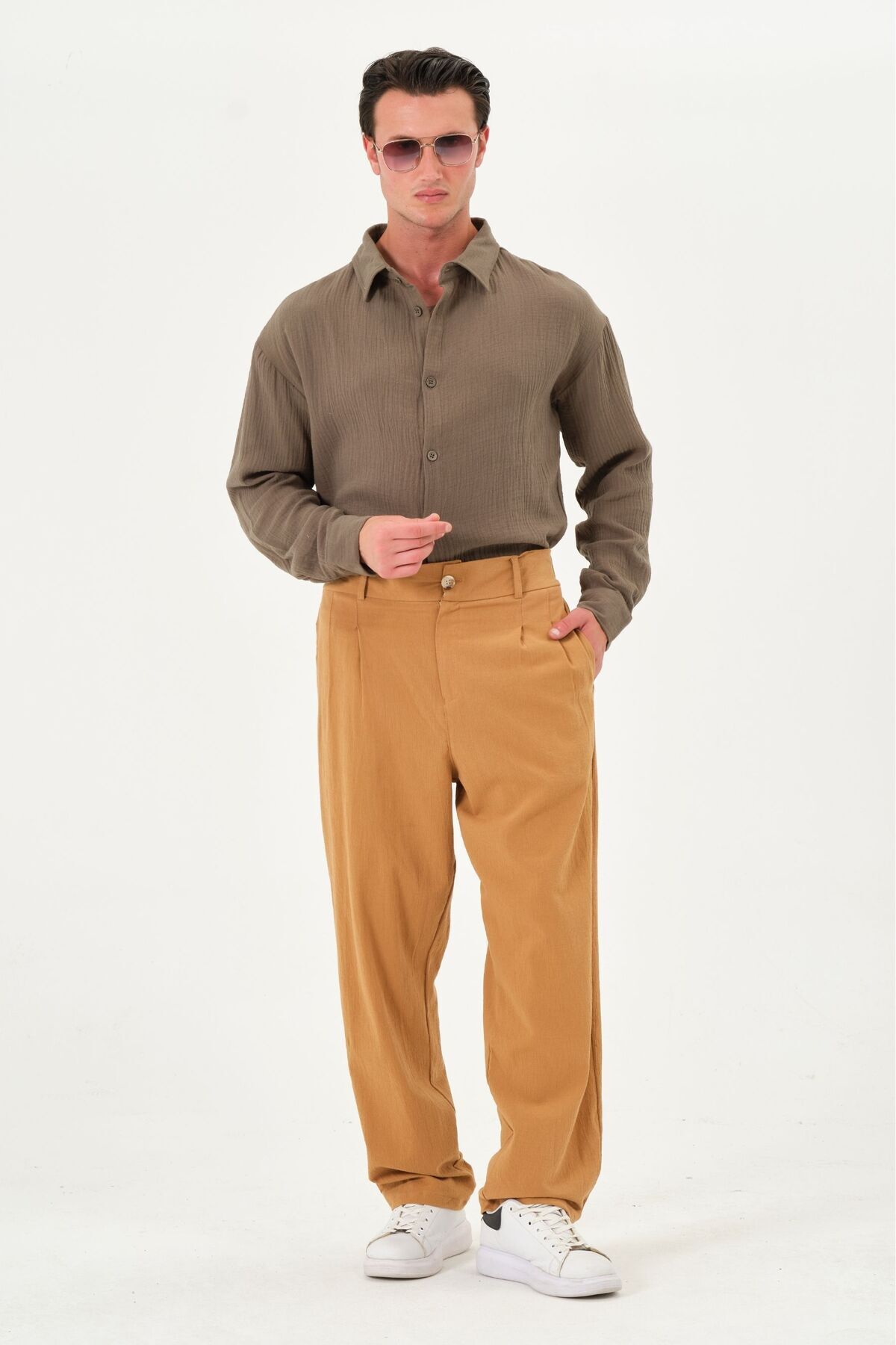 %100 Pamuk Yüksek Bel Bol Paça Pileli Yazlık Erkek Pantolon Camel %100 Pamuk Yüksek Bel Bol Paça Pileli Yazlık Erkek Pantolon Camel p2-k1 9XL